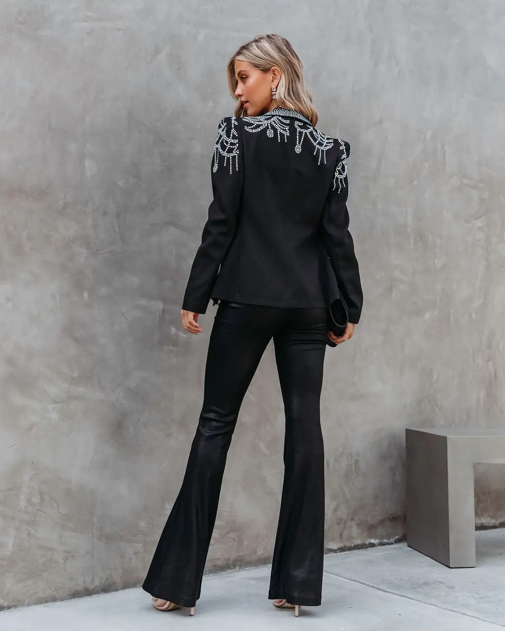 Elevate your holiday style in the Waking Up In Vegas Rhinestone Embellished Blazer in black that features padded shoulders.