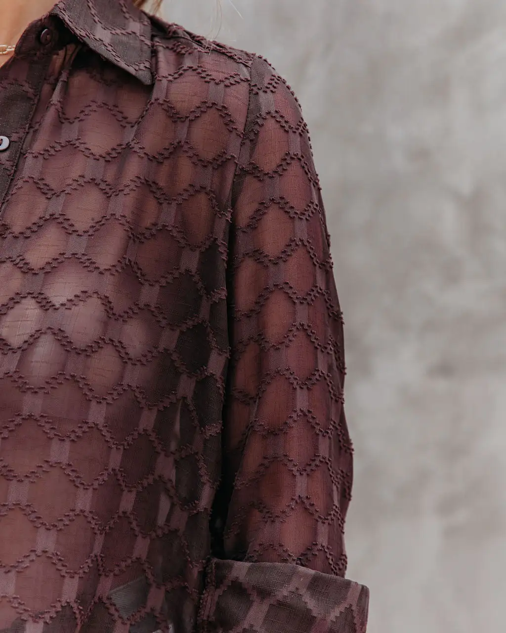 //VICI Exclusive//Best Seller// New Color// Our Eleventh Hour Textured Button Down Blouse goes from the desk to drinks! This brown sheer textured blouse features a collar and front button closure. Wear a white or nude cami under this sheer top. Styled with the Perfect Hoop Earrings, Shayne Gold Link Necklace, Compass Coin Necklace, Chloe Mini Necklace, Simple Bangle Bracelet, Chic Crossbody Chain Pouch Bag, Kason Distressed High Rise Denim, and Bella Faux Leather Strappy Kitten Heel.