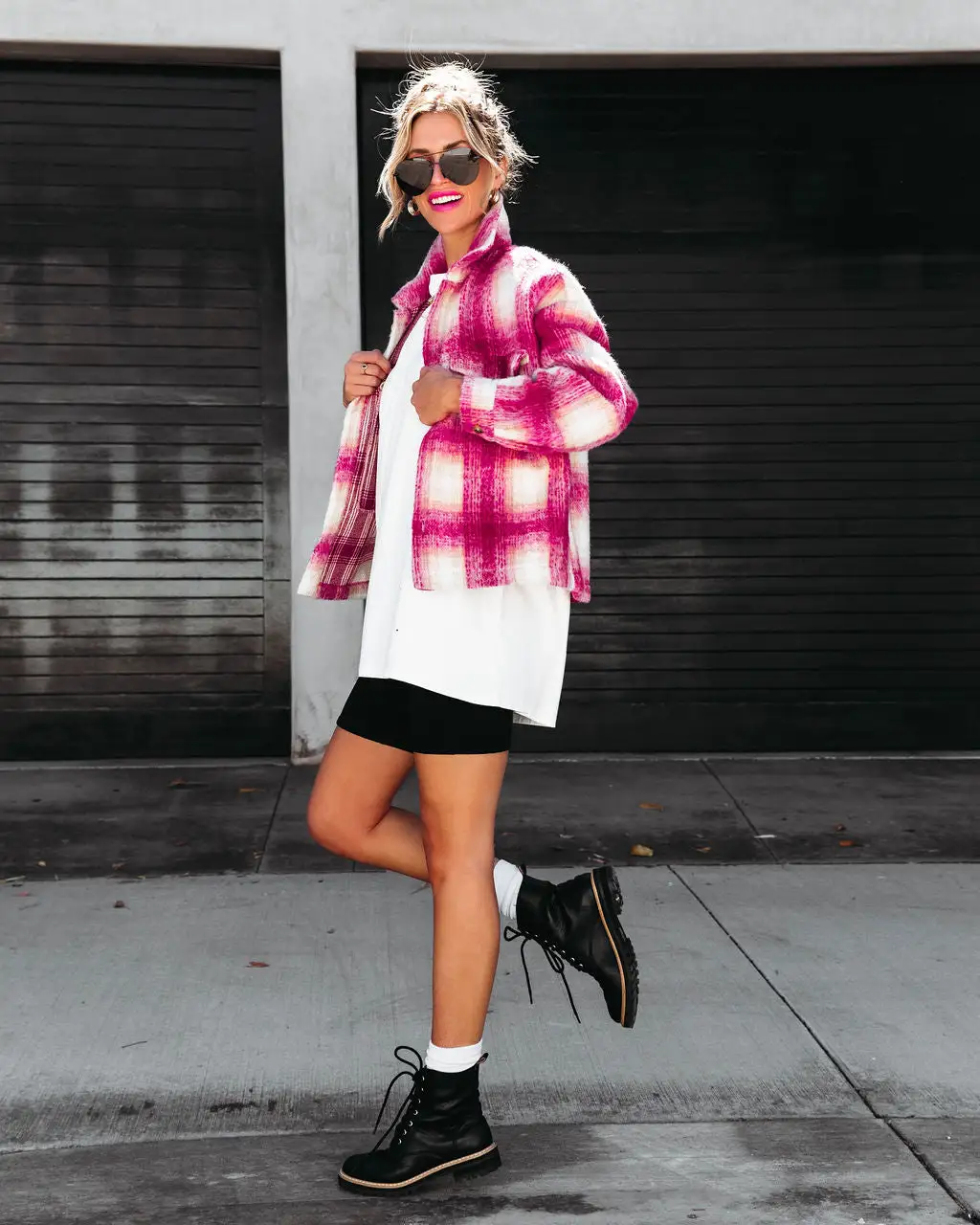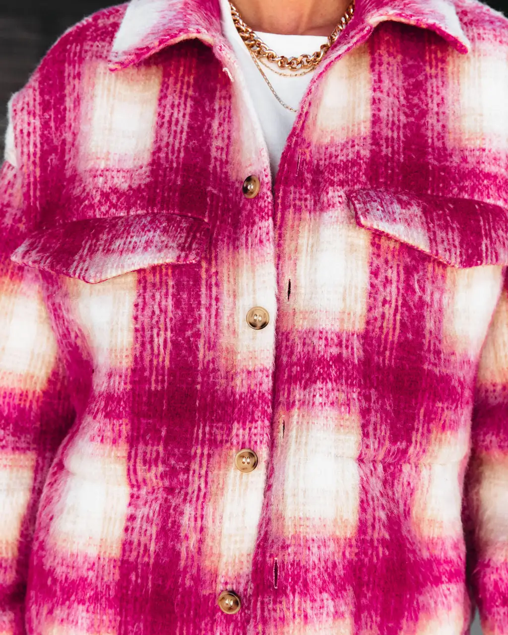 Brighten up your wardrobe in the Girly In Plaid Pocketed Shacket in pink that features bust pockets.