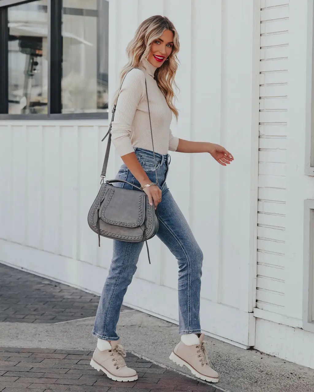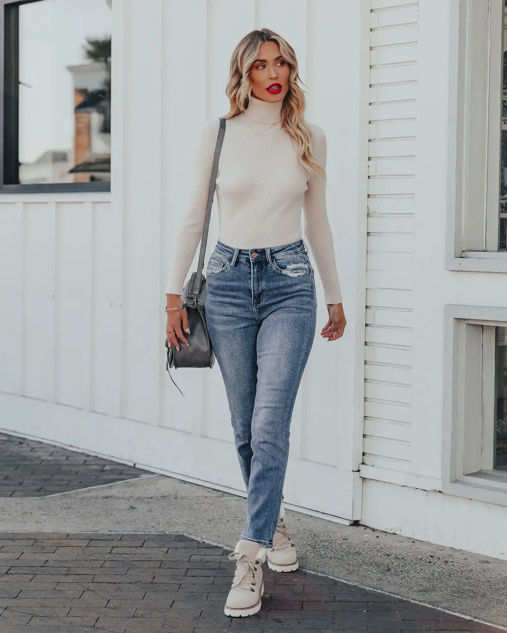 Our Addilyn Turtleneck Knit Sweater pairs best with a blazer and denim! This light blush hued sweater is crafted with long sleeves and a turtleneck. Tuck this sweater into anything high waisted. Styled with the Tahiti Hoops, Simple Bangle Bracelet, Highland Bag, Benji High Rise Slim Straight Denim, and Grady Sherpa Lace Up Boot.