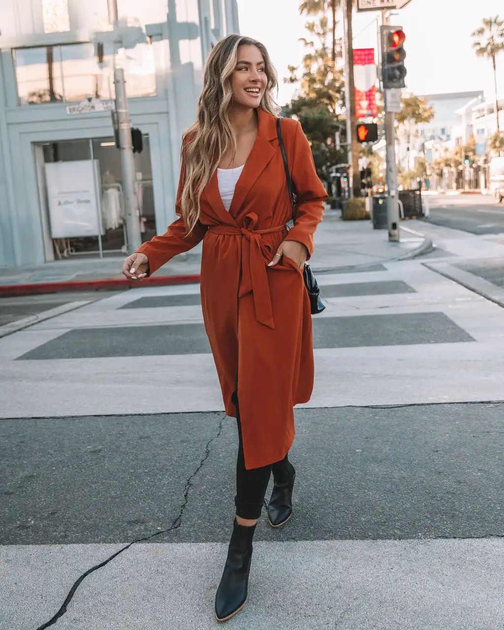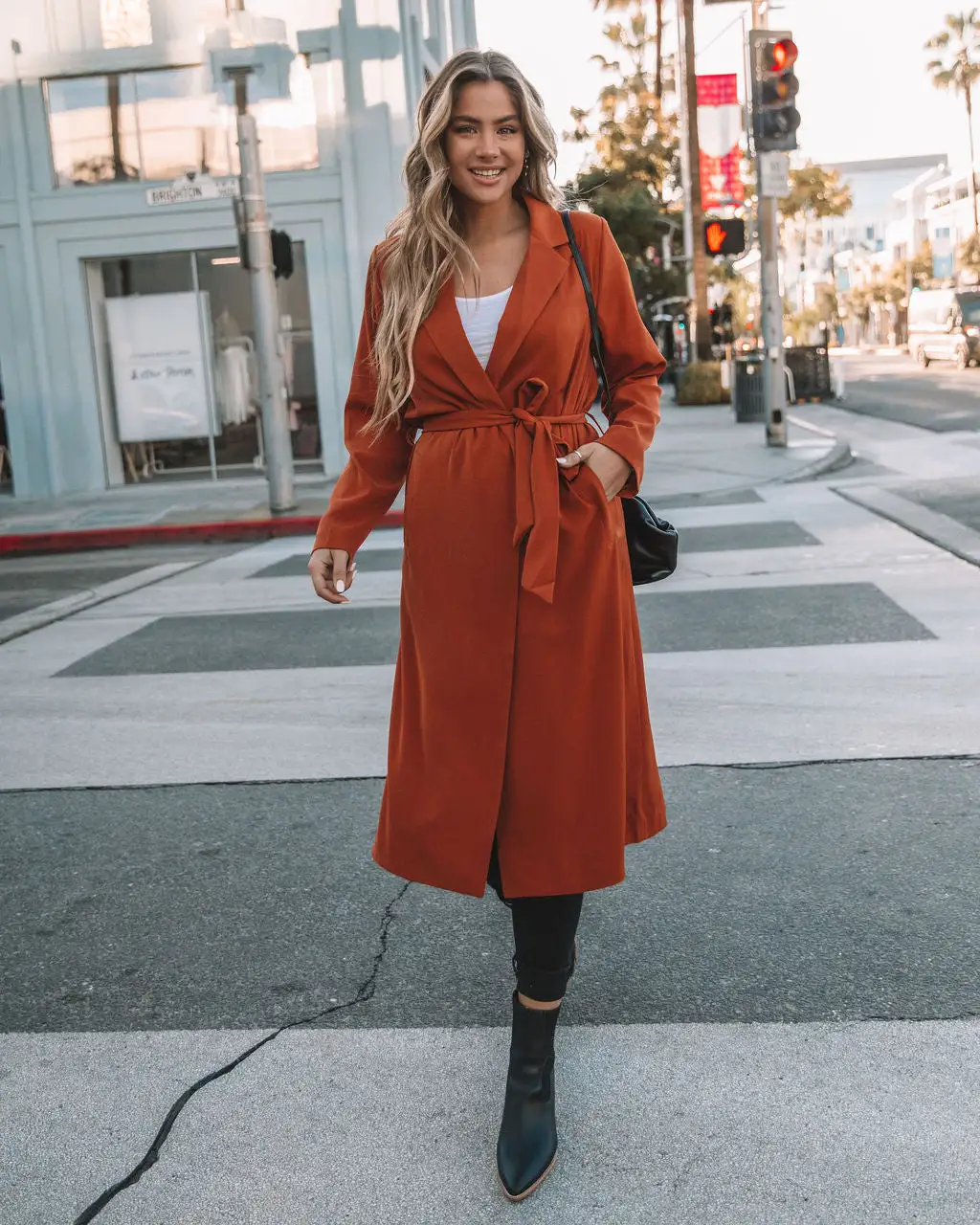Light up the room in our Alfred Pocketed Lightweight Trench Coat! This rust colored trench coat is cinched with an adjustable waist tie. Designed with a collar and padded shoulders. Styled with Willa Faux Leather Crossbody Bag, Physique Racerback Tank, Orion High Rise Distressed Skinny, and Jocelyn Heeled Bootie.