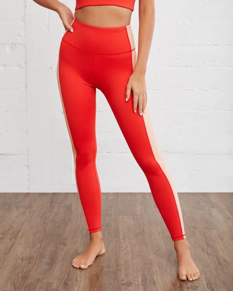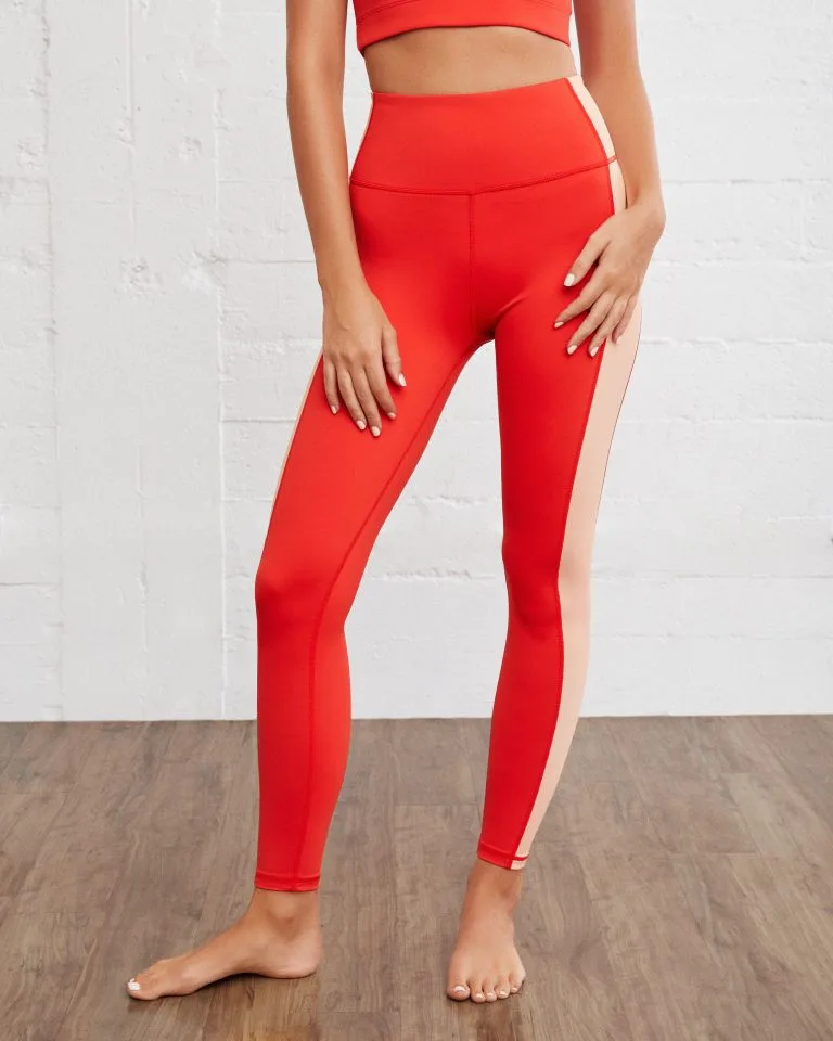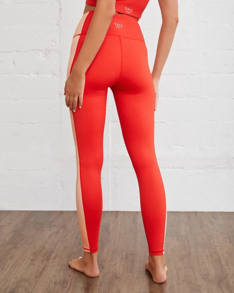 //VICI Exclusive// Our Spark Colorblock Legging will inspire you to get active! These red and peach leggings feature a high rise waistband. Designed with an inner slit pocket. Moisture wicking with a 4 way stretch! Styled with the Spark One Shoulder Sports Bra.