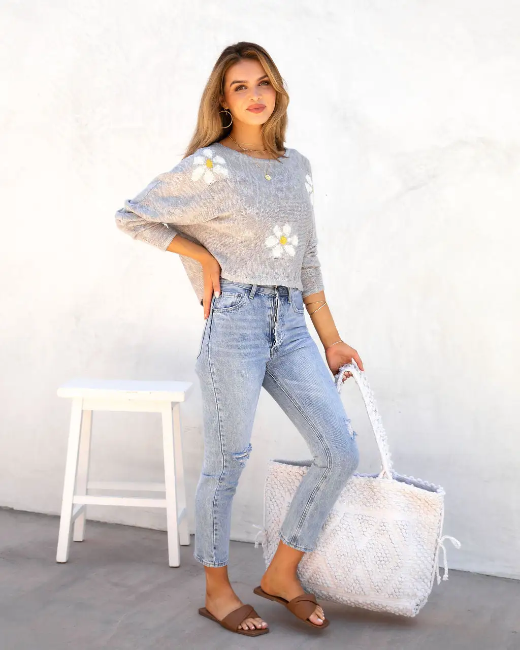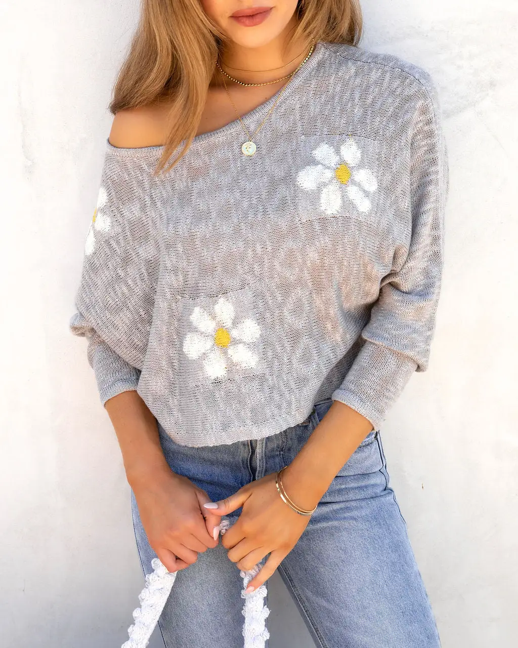 Groovy and cute, the Among The Daisies Knit Sweater in grey features a wide crew neckline.