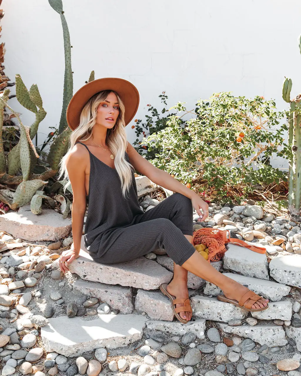 //Best Seller// New Color// The Andy Cotton Blend Pocketed Jumpsuit in asphalt features spaghetti straps that support the front v-neckline.