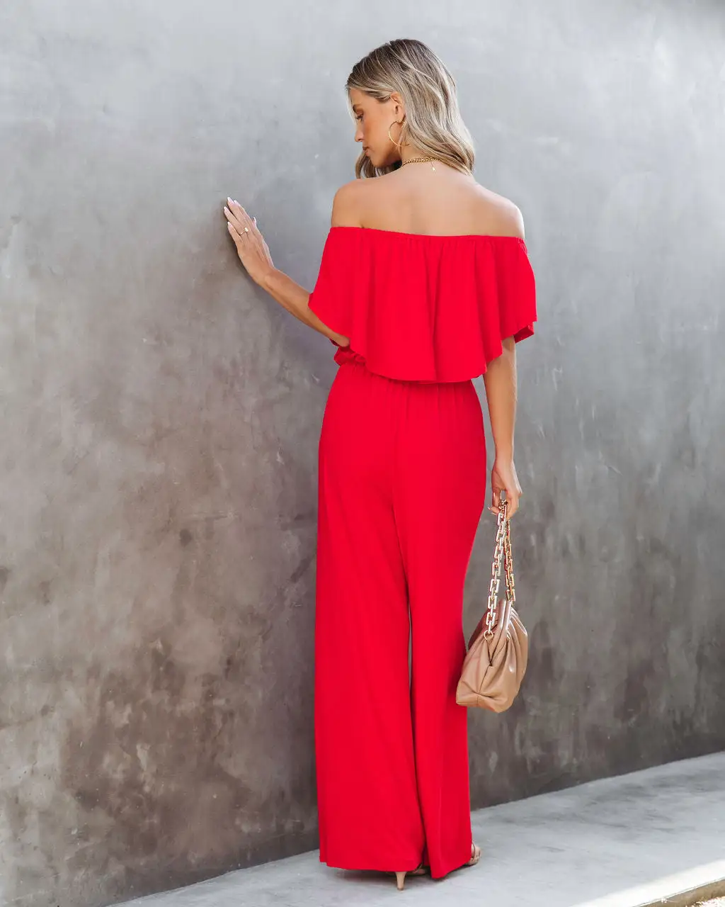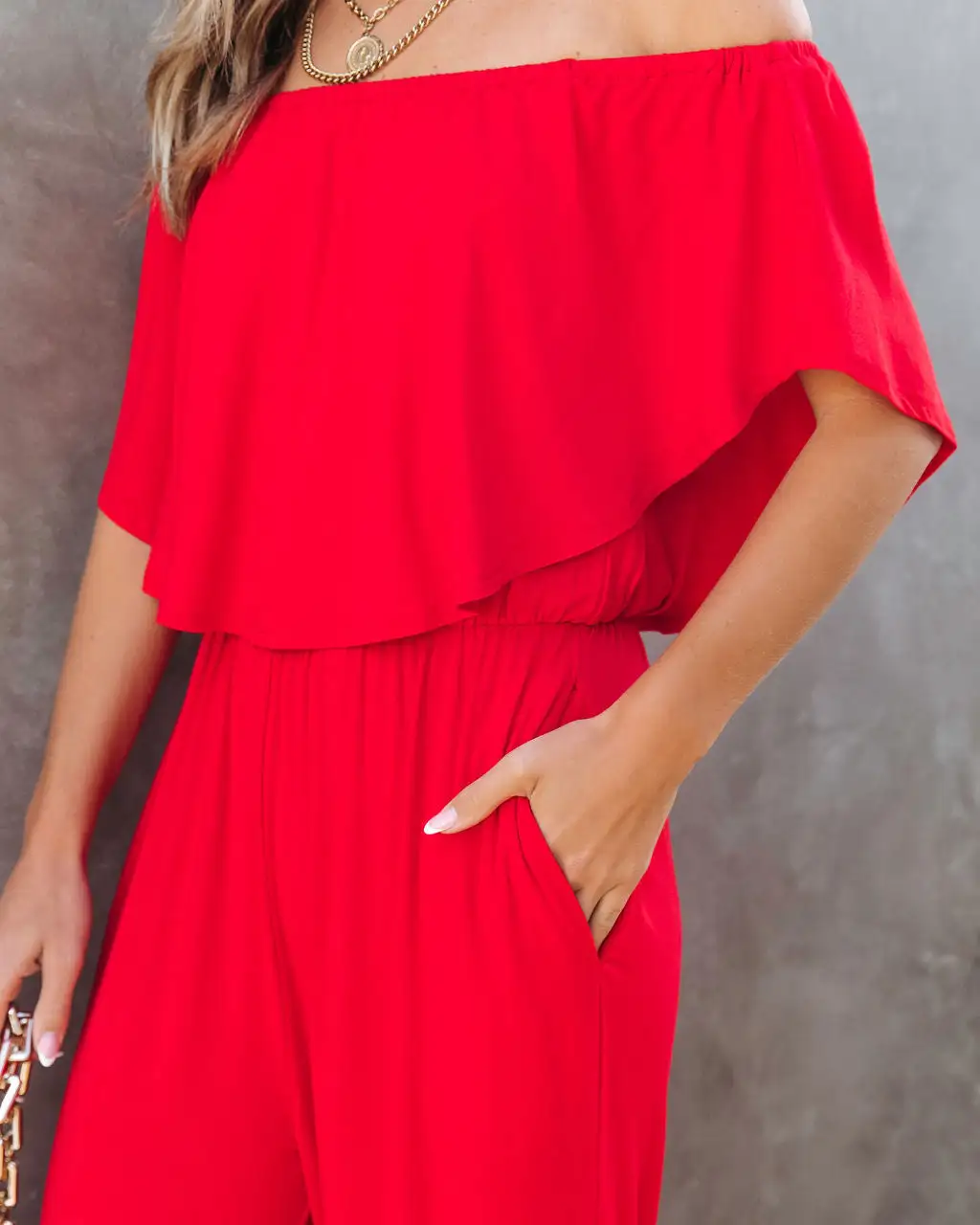 Comfy meets cute in the Antonella Off The Shoulder Pocketed Jumpsuit in red that features a relaxed fit.