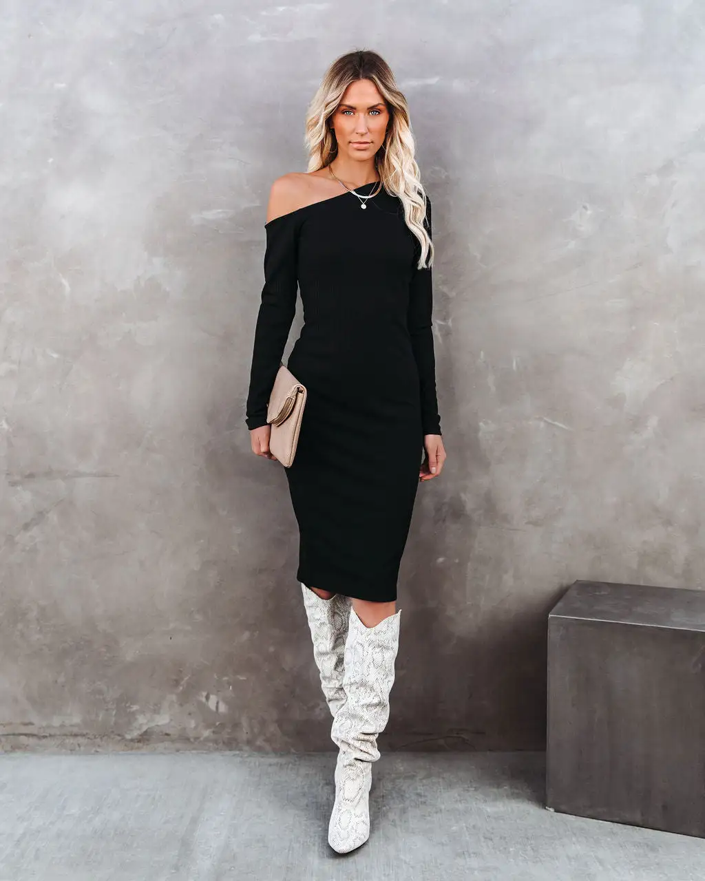 //VICI Exclusive// Our Arielle Off The Shoulder Ribbed Knit Midi Dress has a flattering asymm neckline that’s worn off one shoulder for a sultry style. The fitted silhouette is designed with long sleeves on a black ribbed knit fabric. Pair with heels and a clutch for the upcoming Holiday season. Styled with the Perfect Hoop Earrings, On Demand Herringbone Necklace, Shimmer Pendant Necklace, Stella Crossbody Envelope Zip Clutch, Above The Clouds Pocketed Sherpa Jacket, and Tatum Heeled Scrunch Boot.