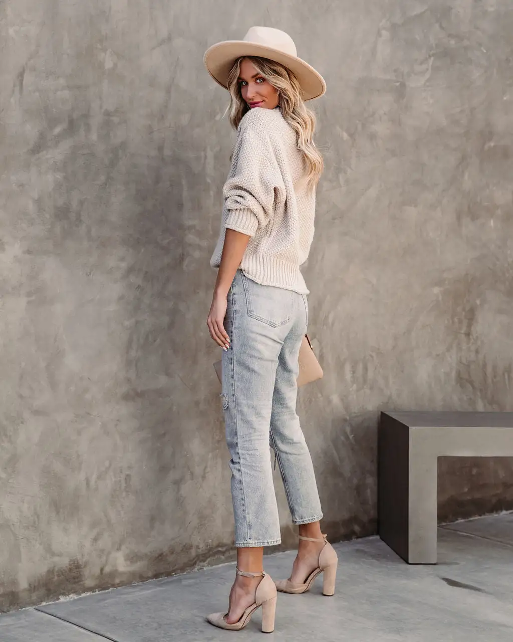 Our Arwen V-Neck Knit Sweater is classically cozy! This taupe colored sweater is detailed with a v-neckline. Designed with long sleeves and ribbed edges. Tuck this top into distressed denim. Styled with the El Dorado Hat, Perfect Hoop Earrings, Chloe Mini Necklace, Initial Card Necklace, Simple Bangle Bracelet, Stella Crossbody Envelope Zip Clutch, Kason Distressed High Rise Denim, and Ritz Faux Suede Pointed Heel.