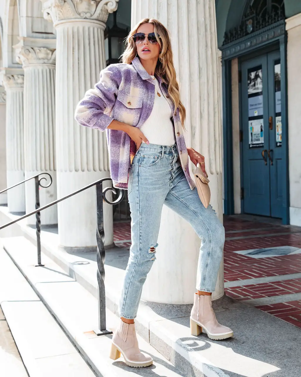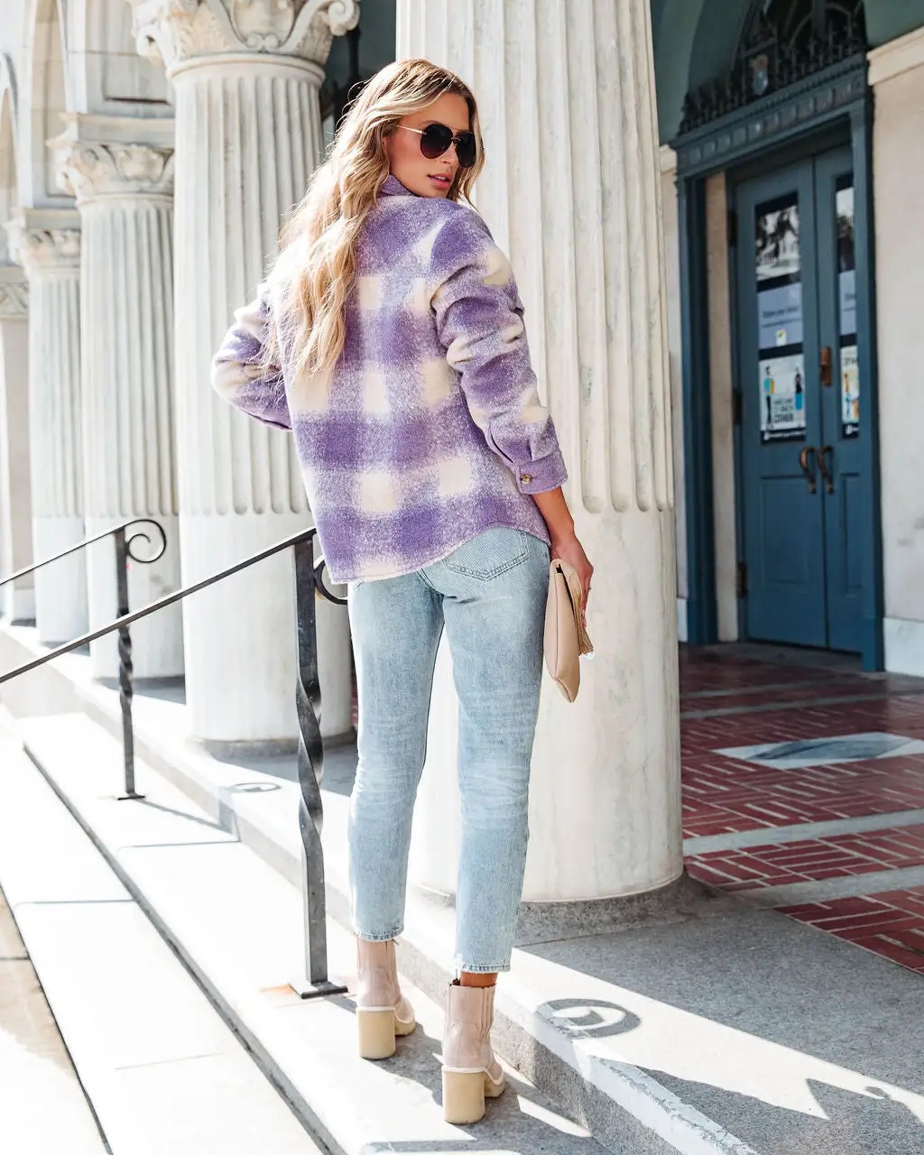 Head up the mountains in the Aspen Is Calling Pocketed Plaid Jacket in purple and cream that features front button closures.