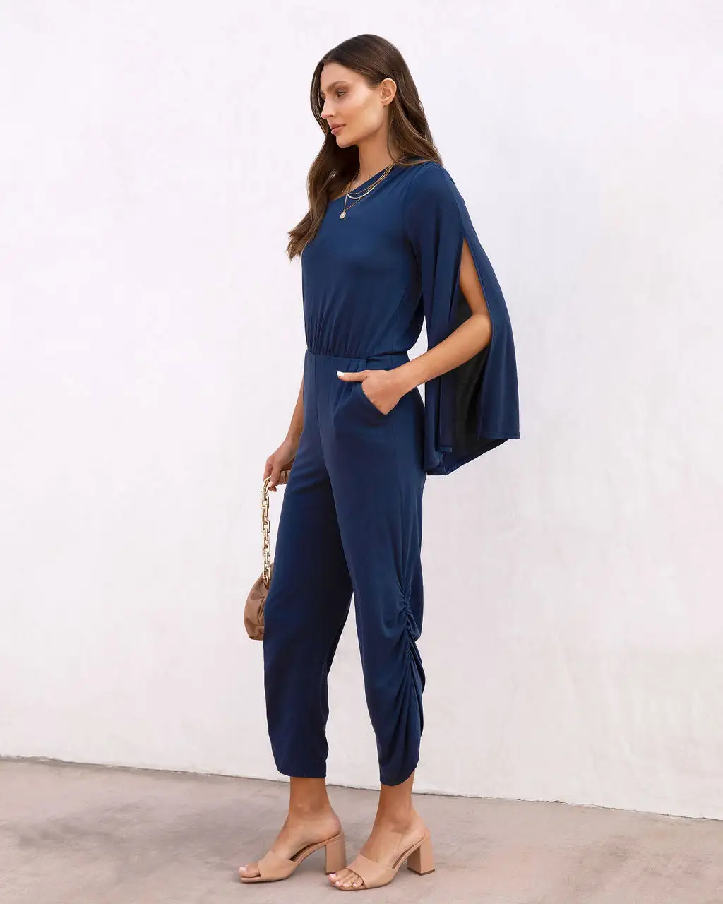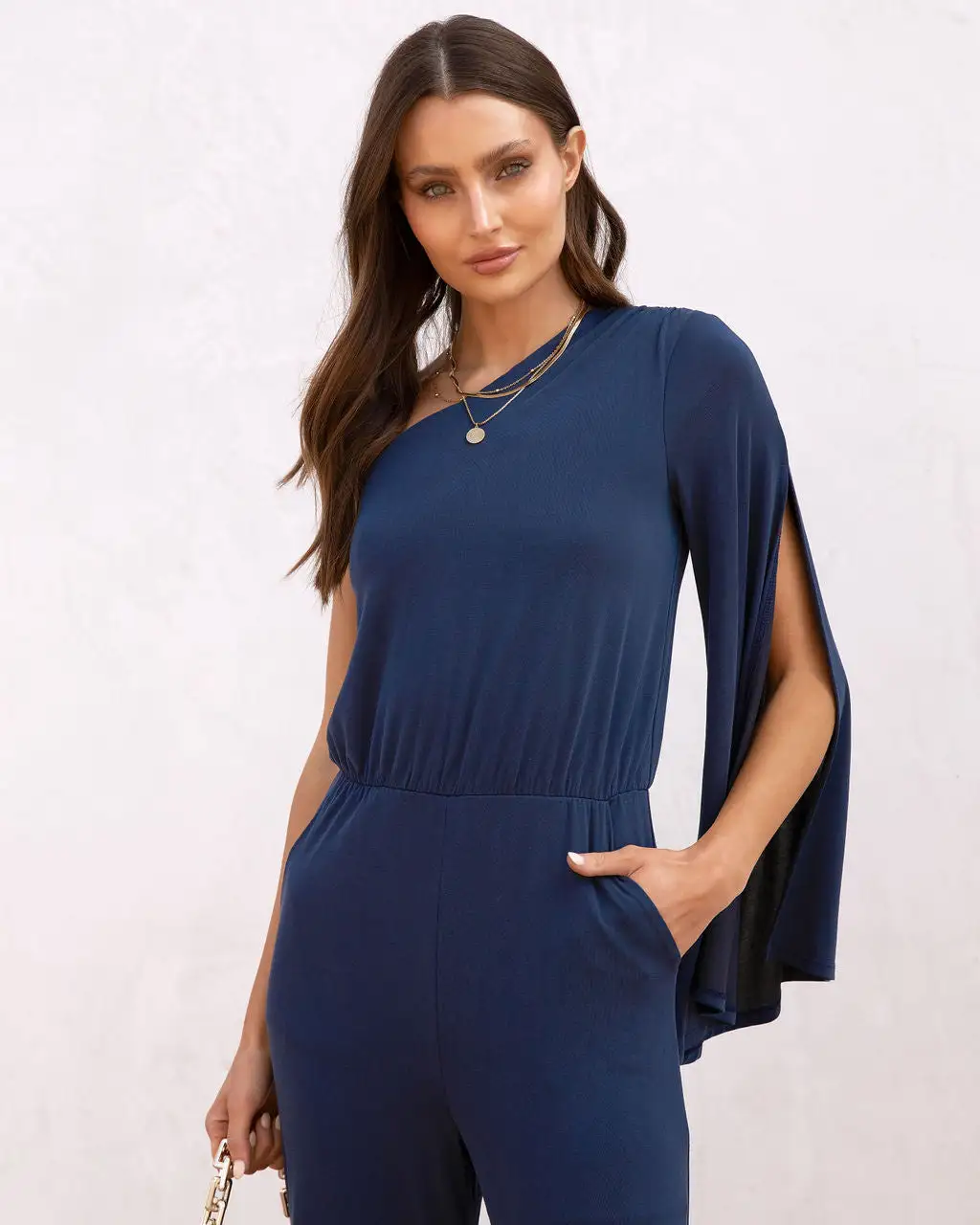 Look effortlessly cool in the Avery One Shoulder Pocketed Jumpsuit in Navy that features a relaxed fit.
