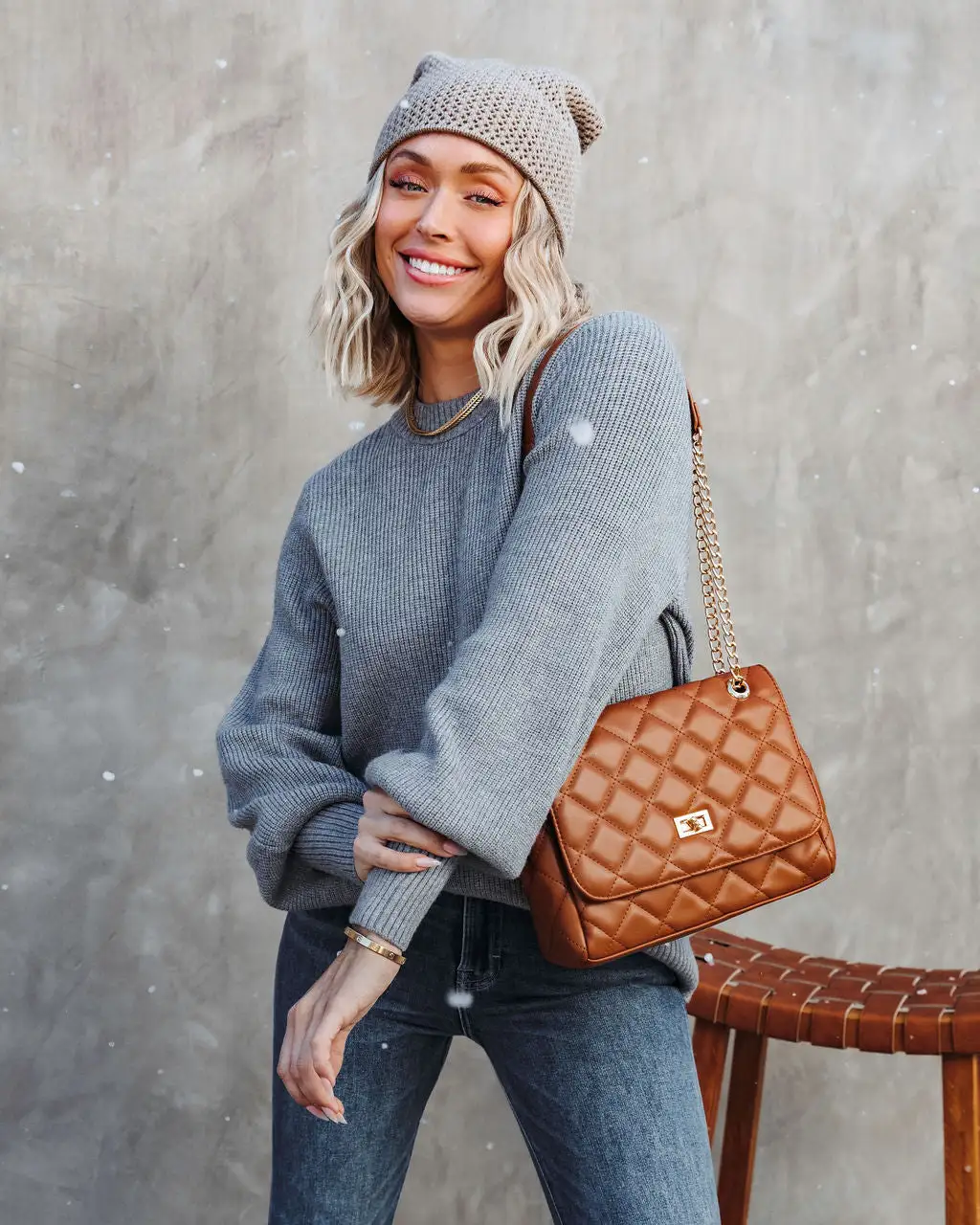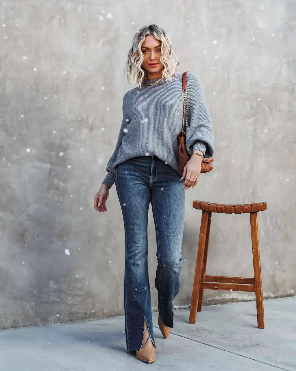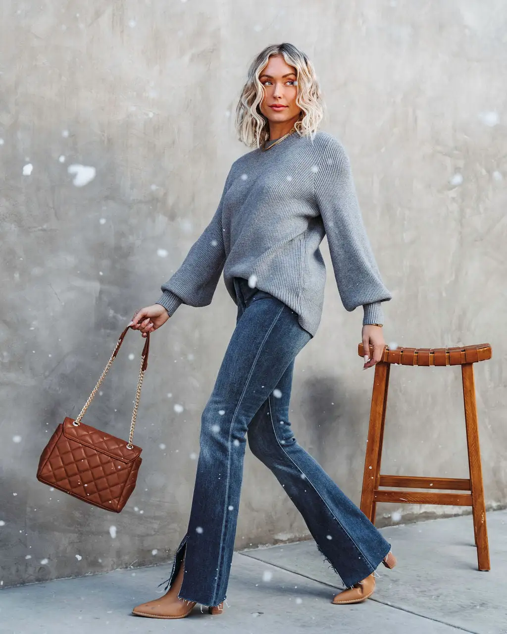 Cuddle up in the Baby It’s You Knit Balloon Sleeve Pullover Sweater in heather grey that features a high neckline.