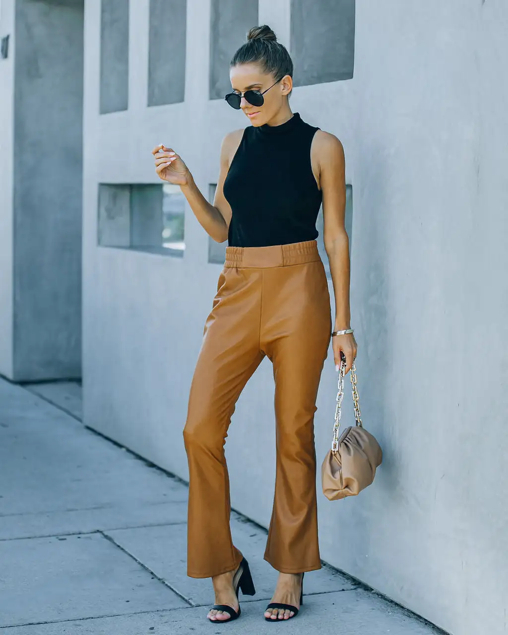 Our Vira High Rise Faux Leather Flare Pants feel so luxe! These cognac pants are crafted with a flare leg. Designed with an elastic waistband and a high rise. Just add heeled booties! Styled with the Lenox Black Frame Grey Gradient Aviator Sunglasses, Simple Bangle Bracelet, Chic Crossbody Chain Pouch Bag, Nyra Sleeveless Mock Neck Knit Top, and Whimsy Heel.
