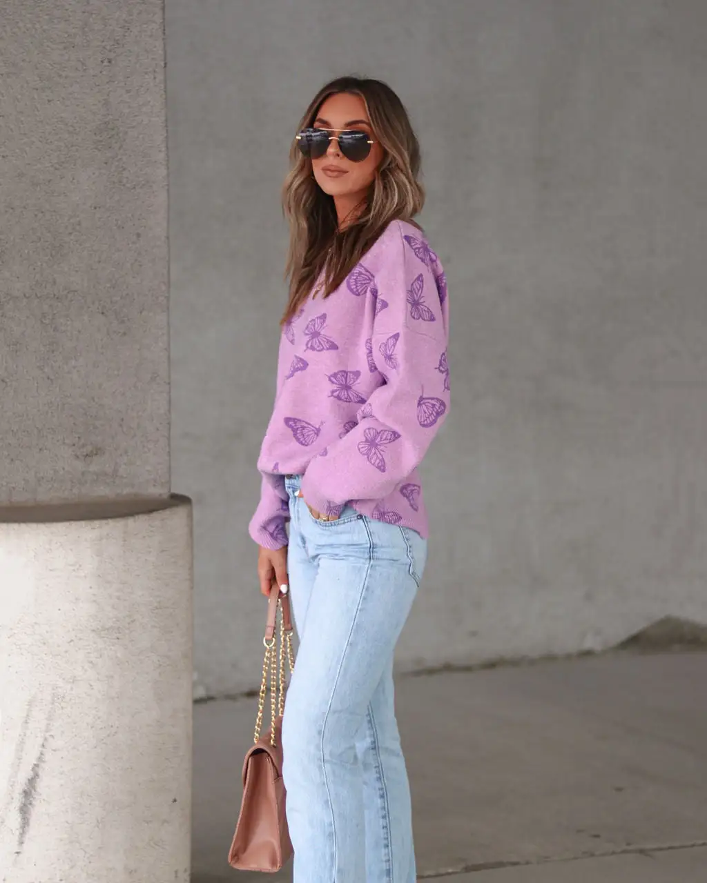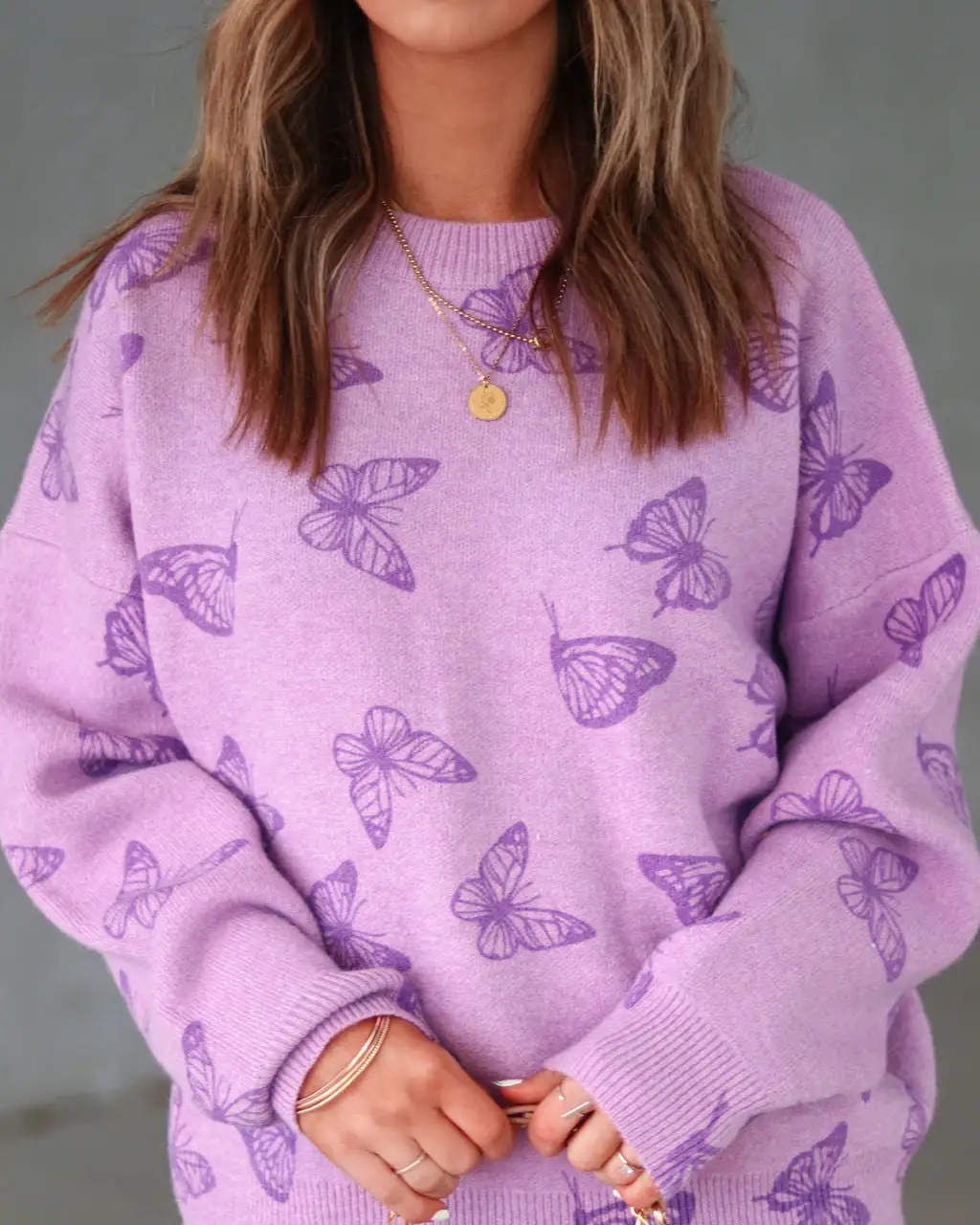 Fun meets comfy in the Be My Butterfly Knit Sweater in lavender that features a relaxed fit.