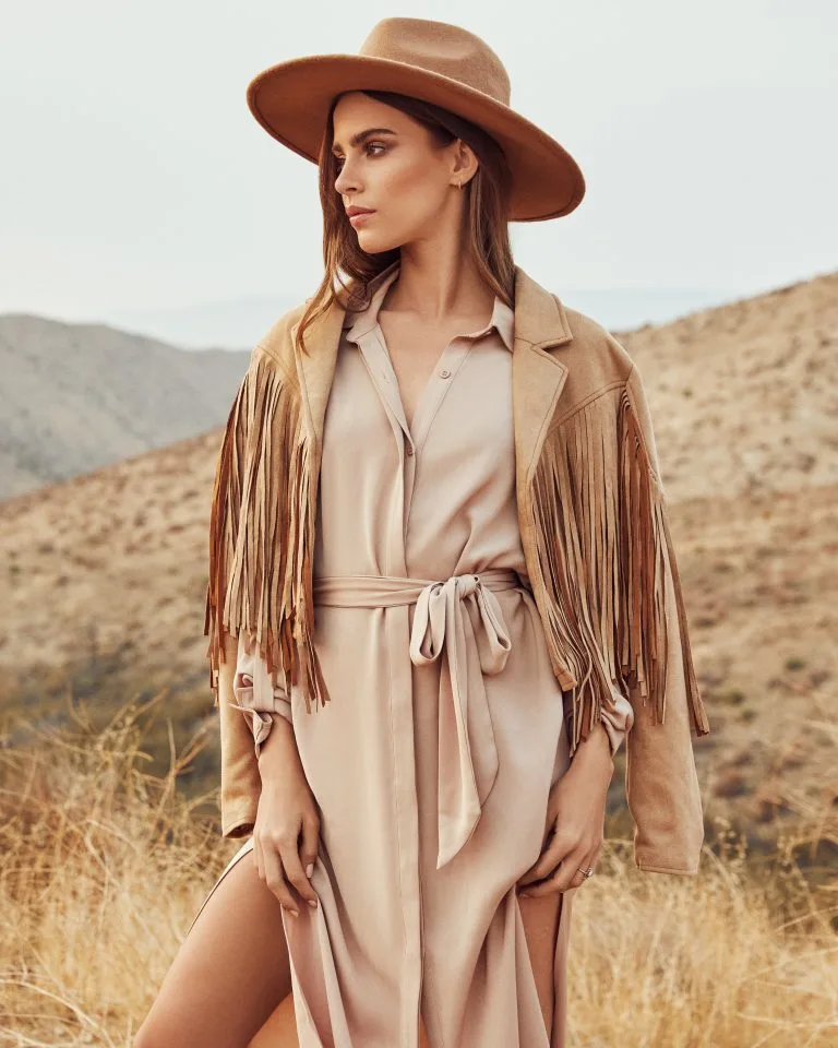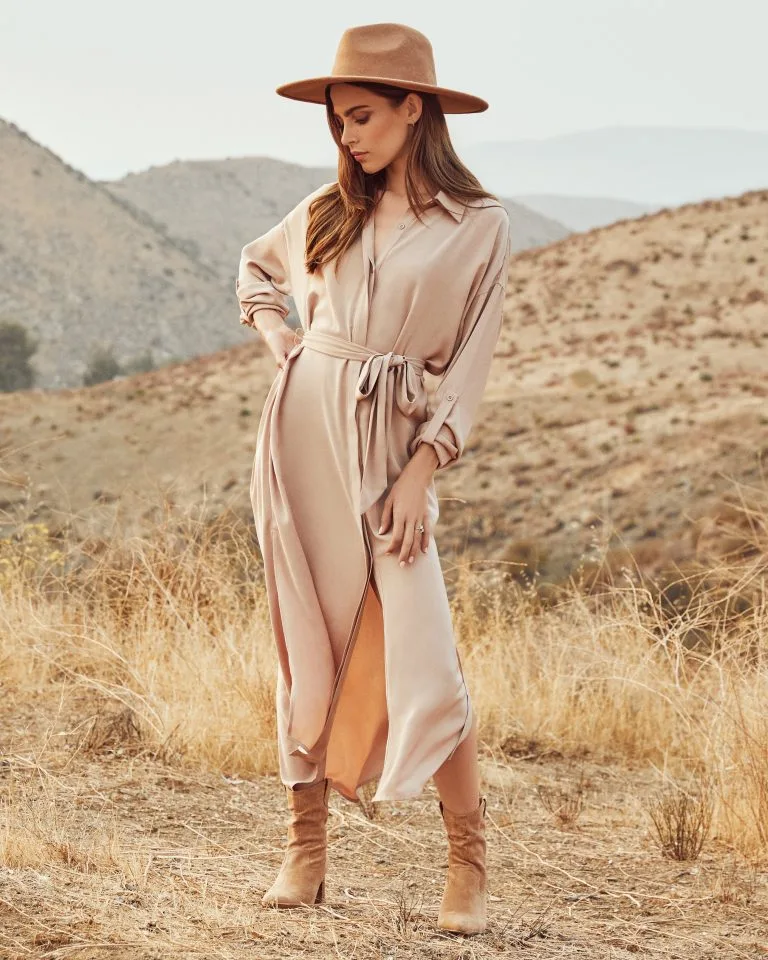 //VICI Exclusive// A collared dress paired with a wide brimmed hat is a western themed dream! Our Betsy Button Down Midi Dress comes in a classic nude hue. Designed with an adjustable waist tie. Styled with the El Dorado Hat, Walford Cropped Fringe Faux Suede Jacket, and Dev Faux Suede Heeled Bootie.