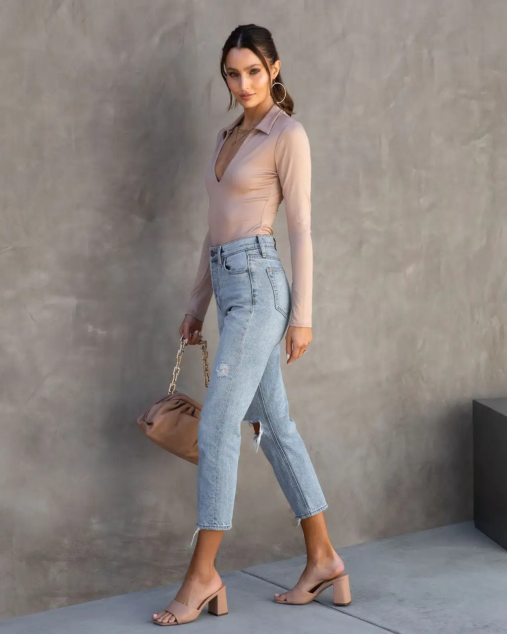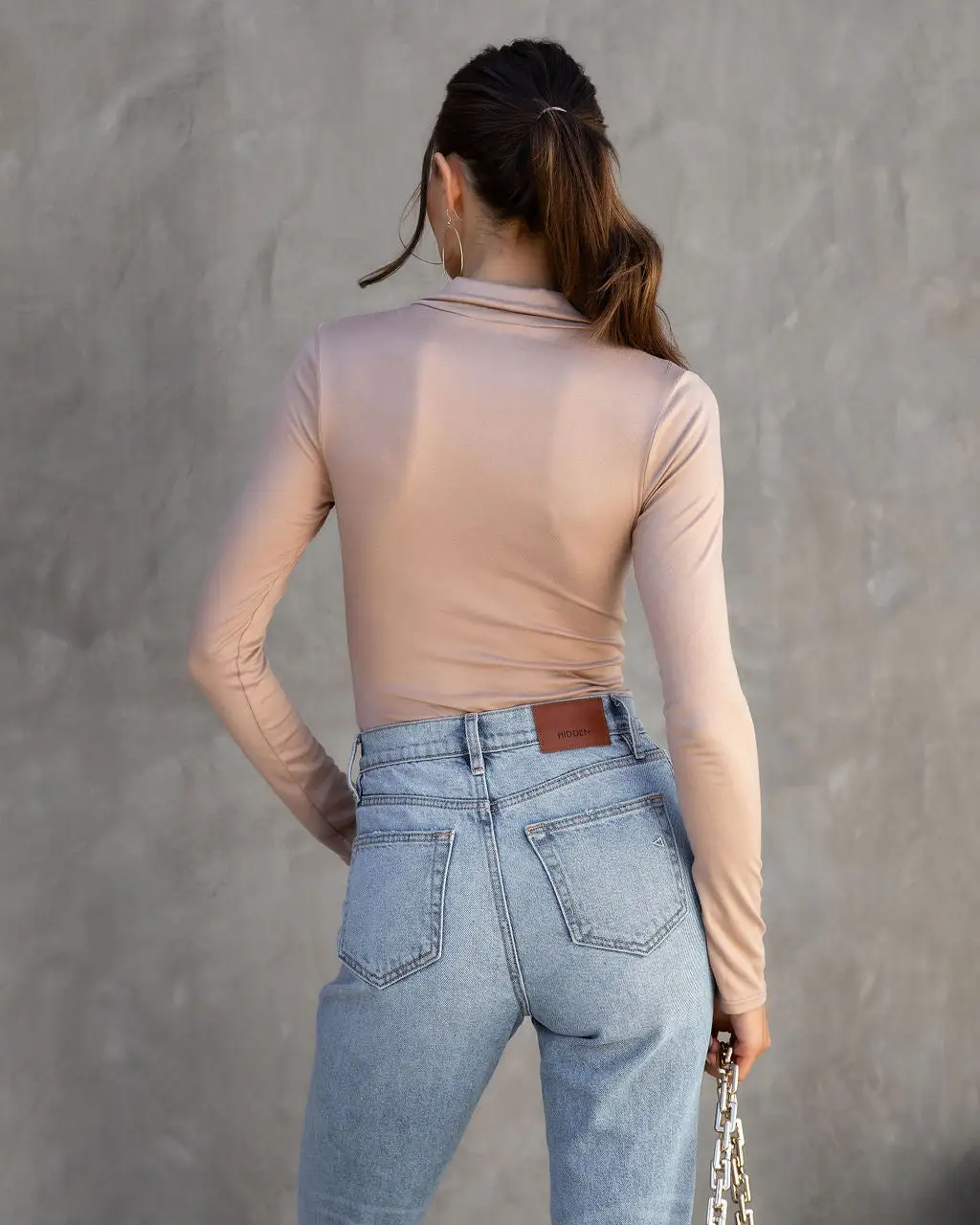 Get ready to take the plunge in the Alessandra Collared Bodysuit in Light Taupe that features a plunging neckline and long sleeve.