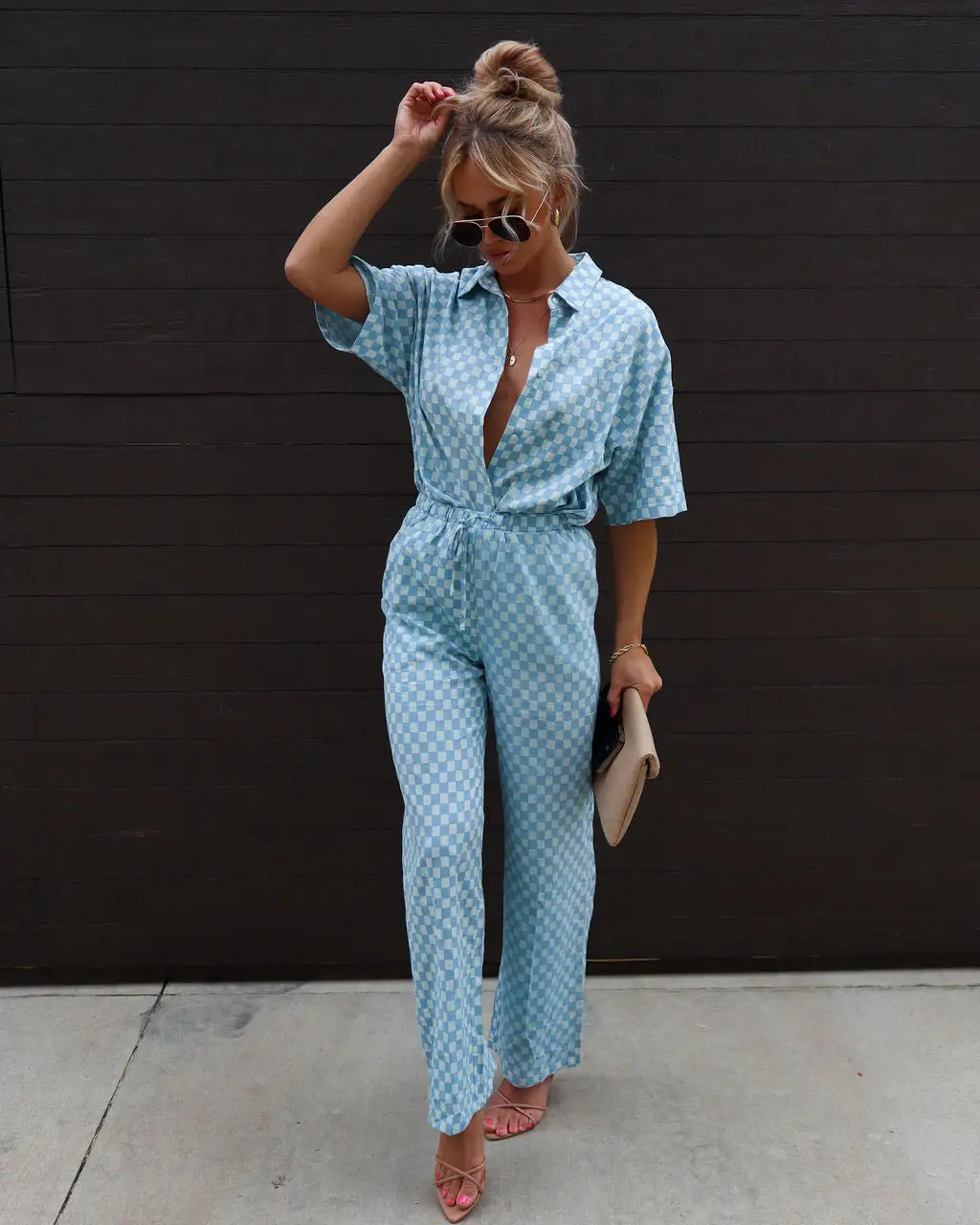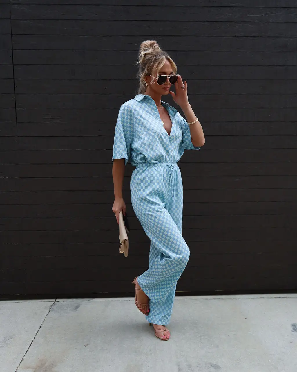 Play in print! Don’t be afraid to make a bold summer statement in the Check Yourself Cotton Blend Drawstring Pants in Blue, that feature a relaxed fit.