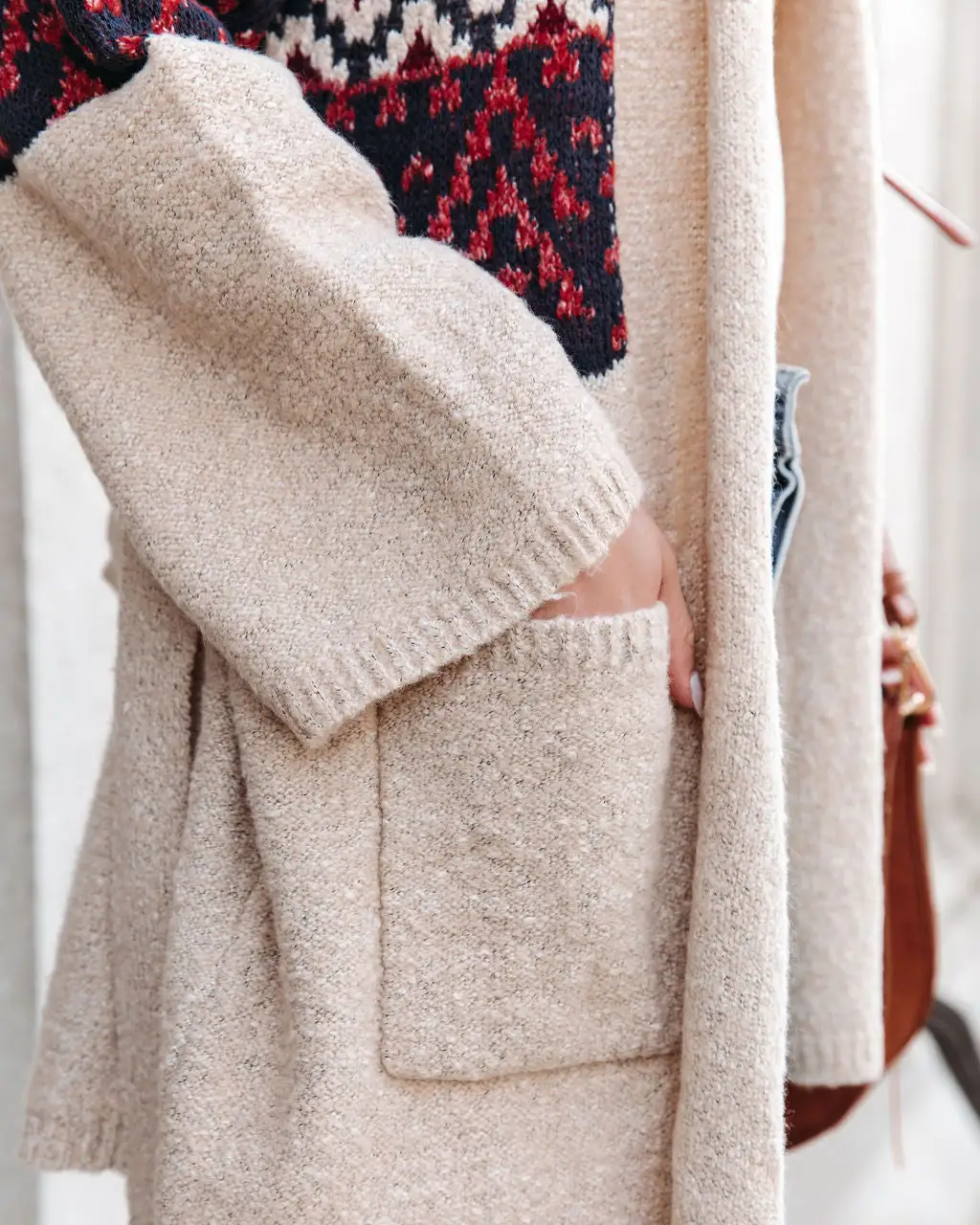 Sip coffee on the porch in our Bobbi Pocketed Belted Knit Cardigan! This natural hued cardi features navy and wine hues. Designed with an adjustable waist tie closure. Finished with front pockets. Styled with the El Dorado Hat, Perfect Hoop Earrings, The Buddha Wheel Necklace, Promise The Moon Crescent Necklace, Highland Bag, Nyra Sleeveless Mock Neck Knit Top, Kason Distressed High Rise Denim, and Colby Faux Suede Heeled Bootie.