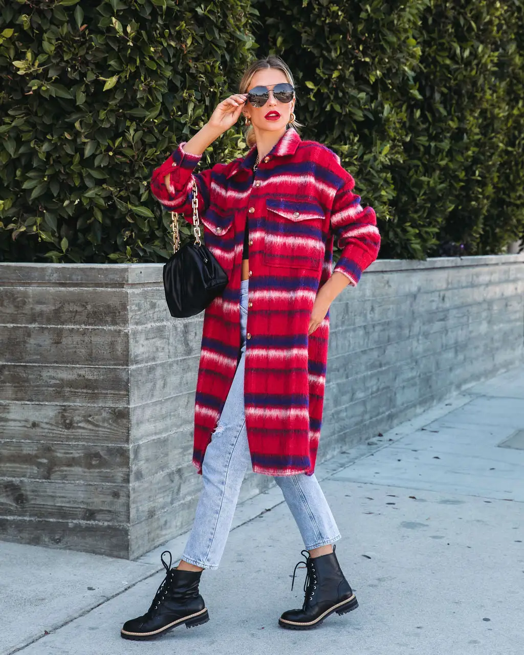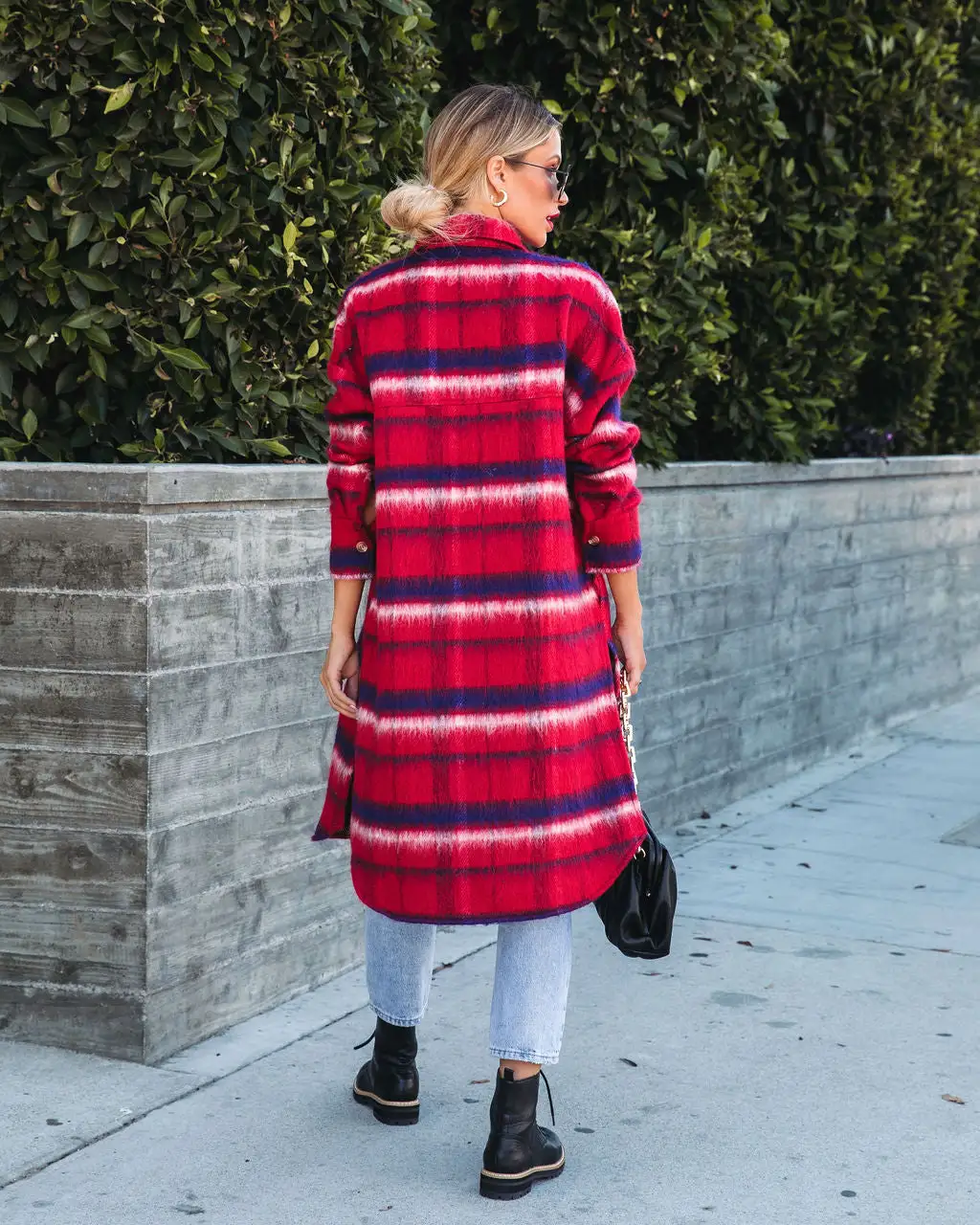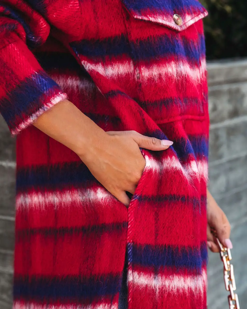 Add the coziest layer of warmth in the Breezy Septembers Pocketed Plaid Button Down Coat in red that features side slits.