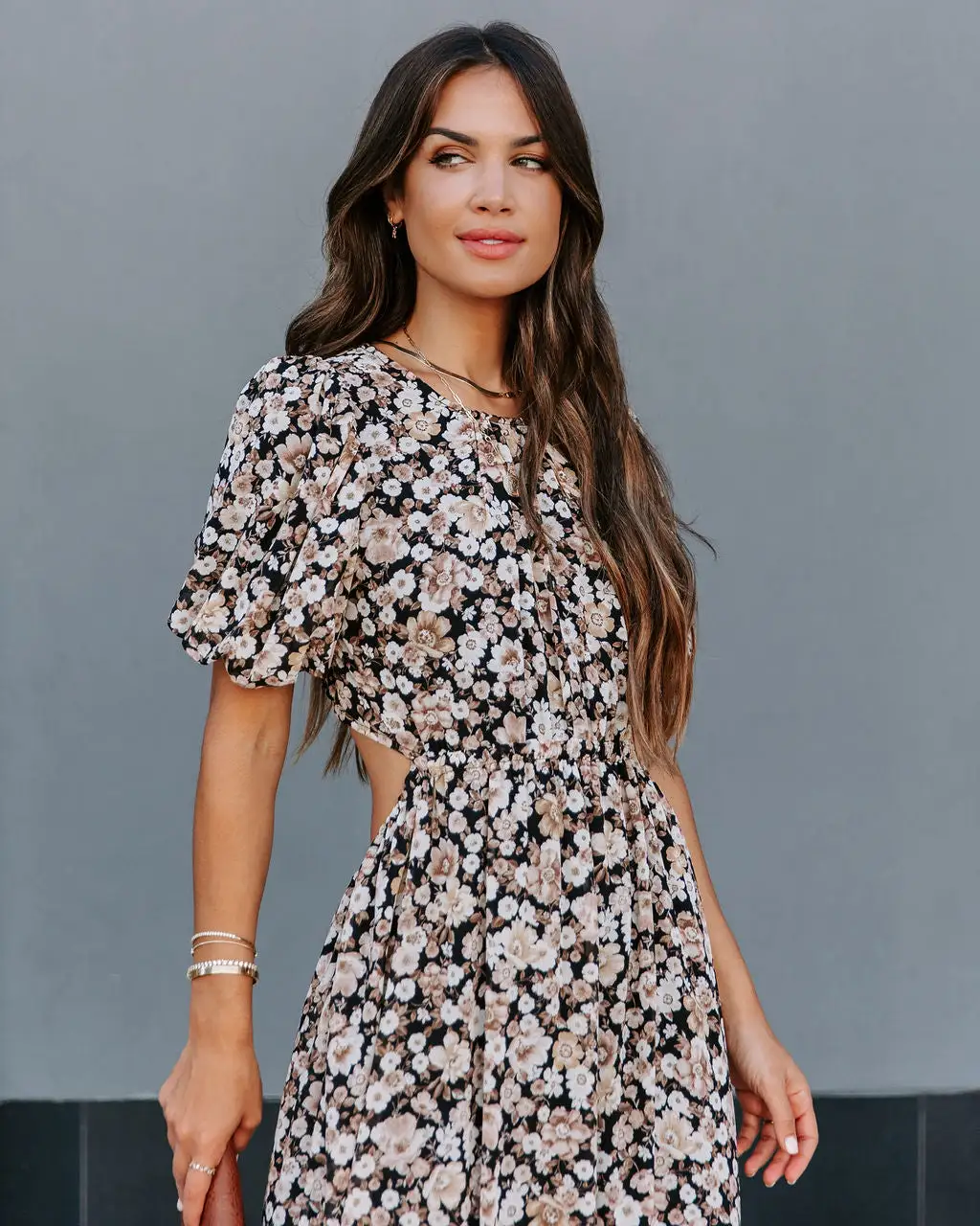 Sweet for Summer, the Birstol Floral Cutout Maxi Dress in black multi features puffy sleeves.