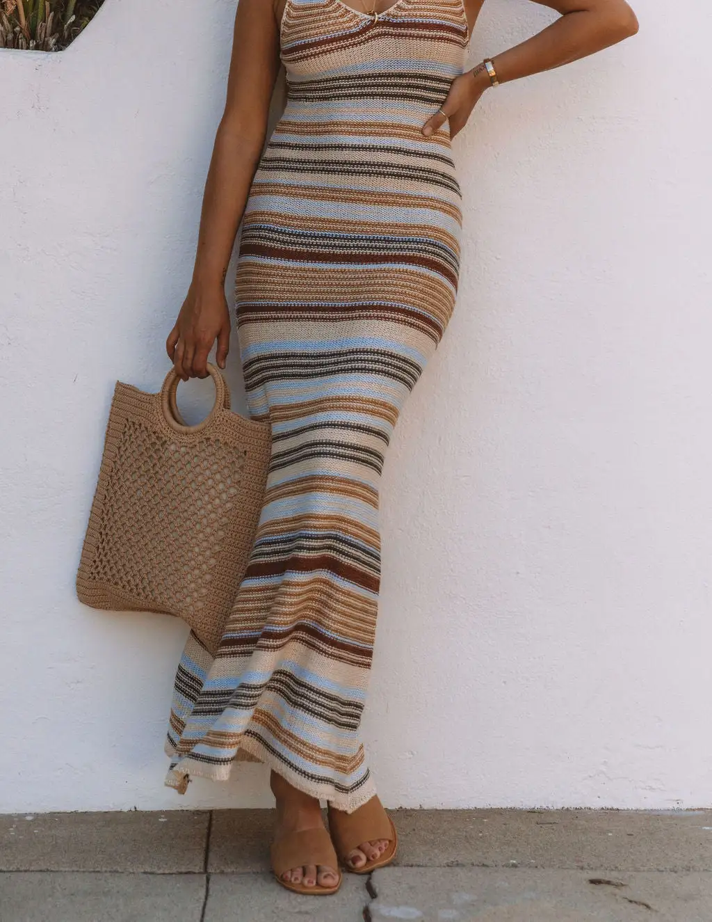 //VICI Exclusive// Our Campbell Striped Knit Maxi Dress was made for tropical vacations! Hues of rust, natural, baby blue, mustard, and charcoal make up this striped knit maxi. The fitted silhouette and v-neckline are ultra flattering.