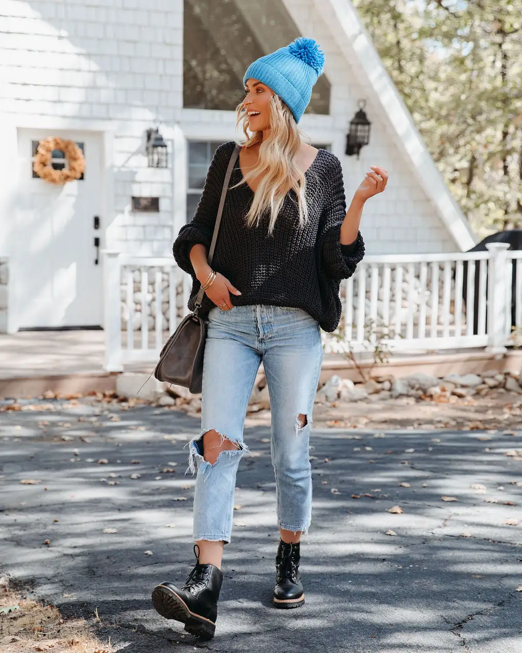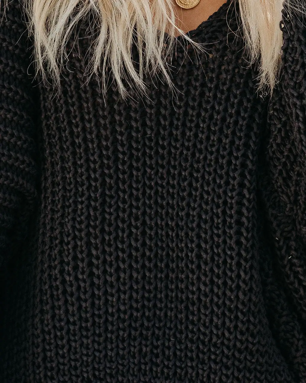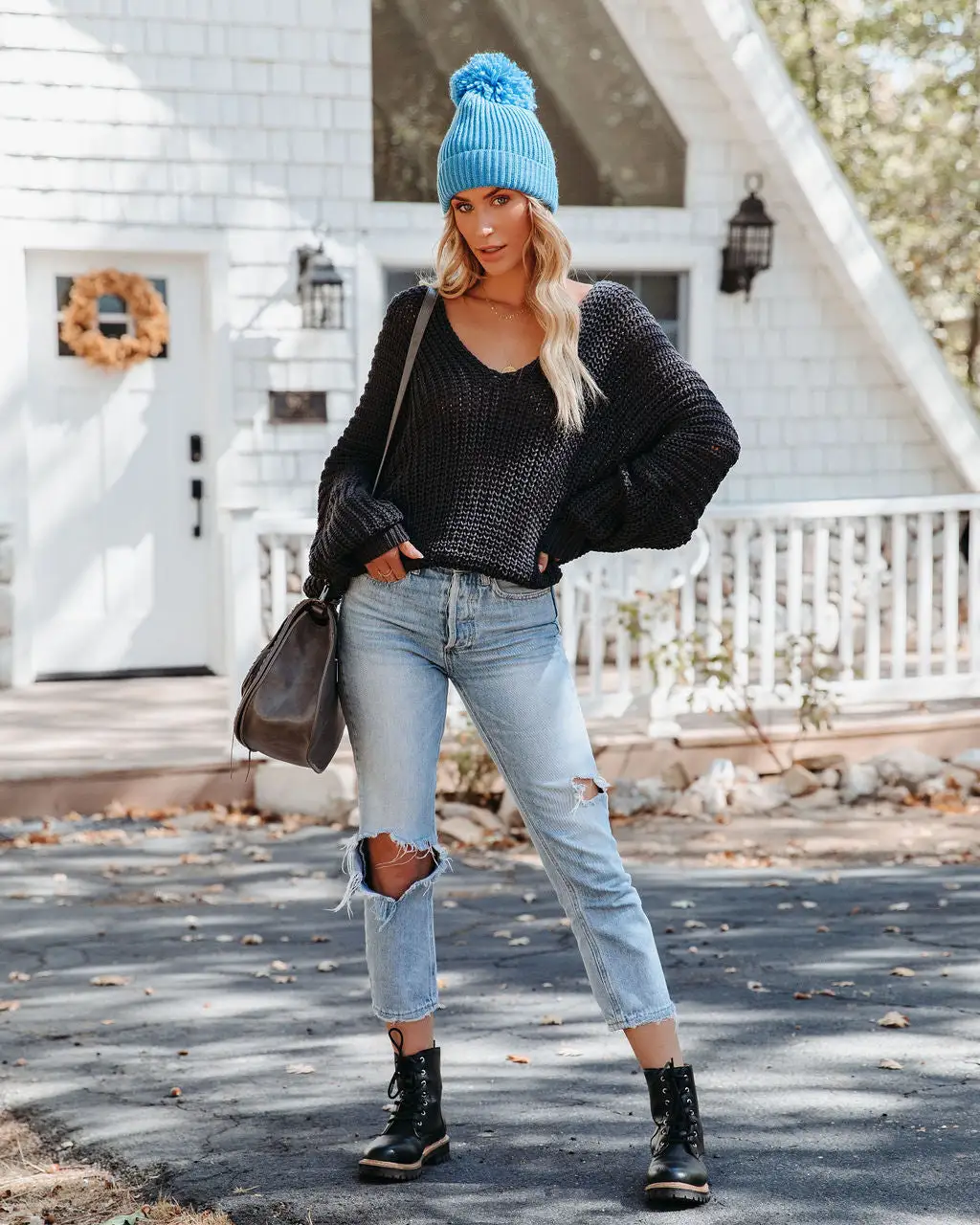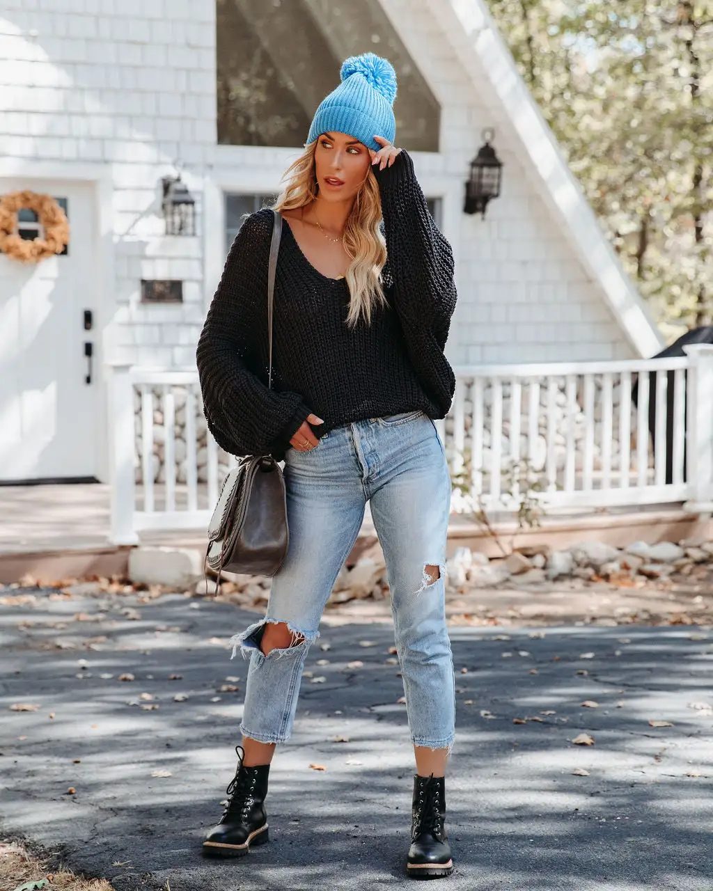 //Best Seller// New Color// Our Carry On Knit V-Neck Sweater is the most chic and coziest of them all! Indulge in the charcoal hued knit that’s cut to fit relaxed and subtly oversized for max comfort and style. Fit with a v-neckline, long rib cuffed sleeves and a ribbed hemline. A trend-forward piece that pairs effortlessly with skirts, denim and jeggings all season long! Styled with the Snowbound Pom Beanie, Chloe Mini Necklace, The Buddha Wheel Necklace, Highland Bag, Kason Distressed High Rise Denim, and Brycen Faux Leather Lace Up Boot.