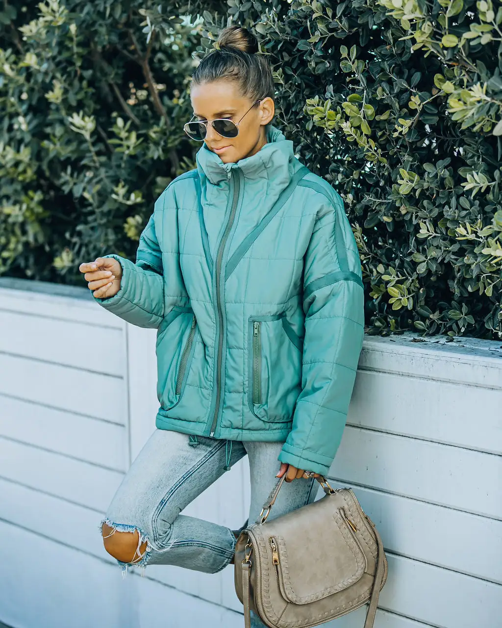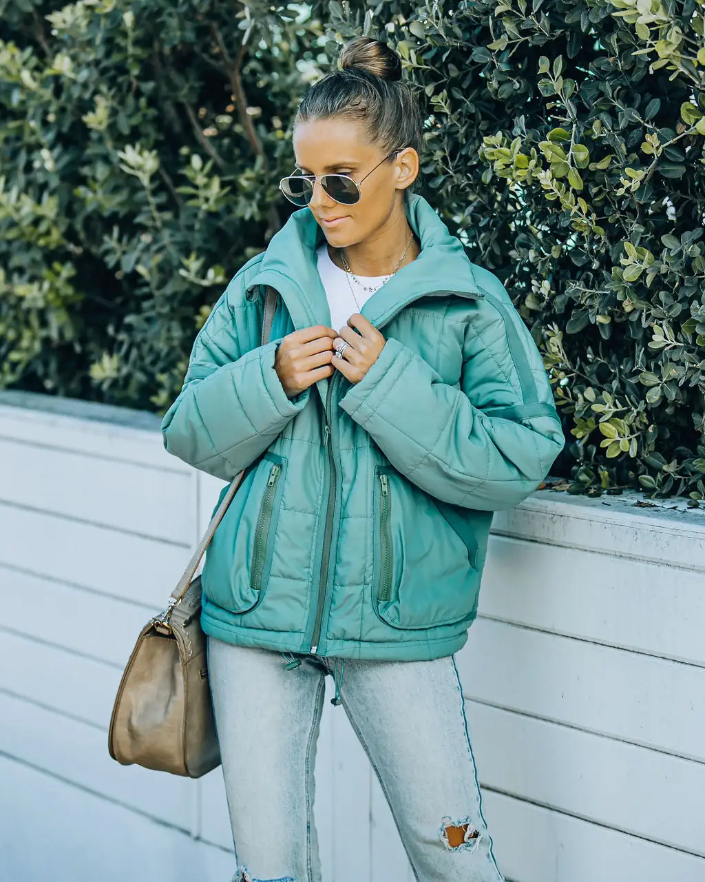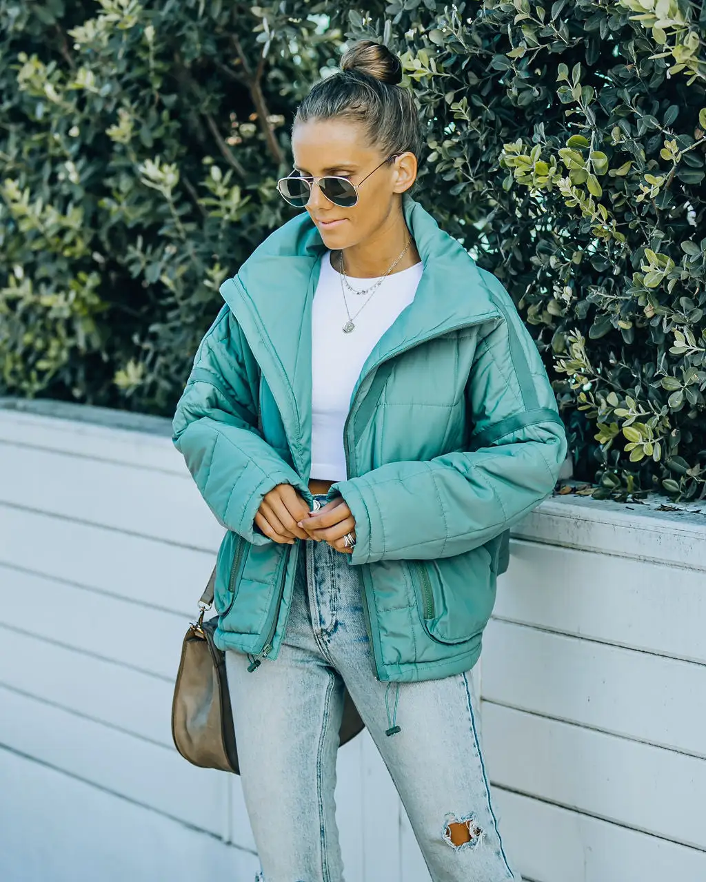 Head to a ski town in our Cassian Pocketed Quilted Puffer Jacket! This seafoam hued jacket will keep you warm all season long. Designed with side and zipper pockets. Secured with front button closures. Styled with the Chloe Mini Necklace, Compass Coin Necklace, Highland Bag, Kiki Knit Crop Top, Kason Distressed High Rise Denim, and Uptown Faux Suede Heeled Bootie.