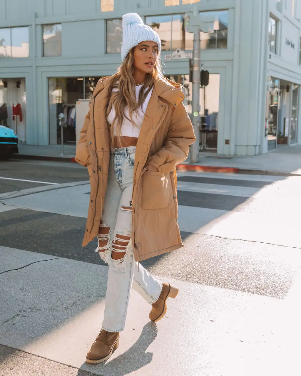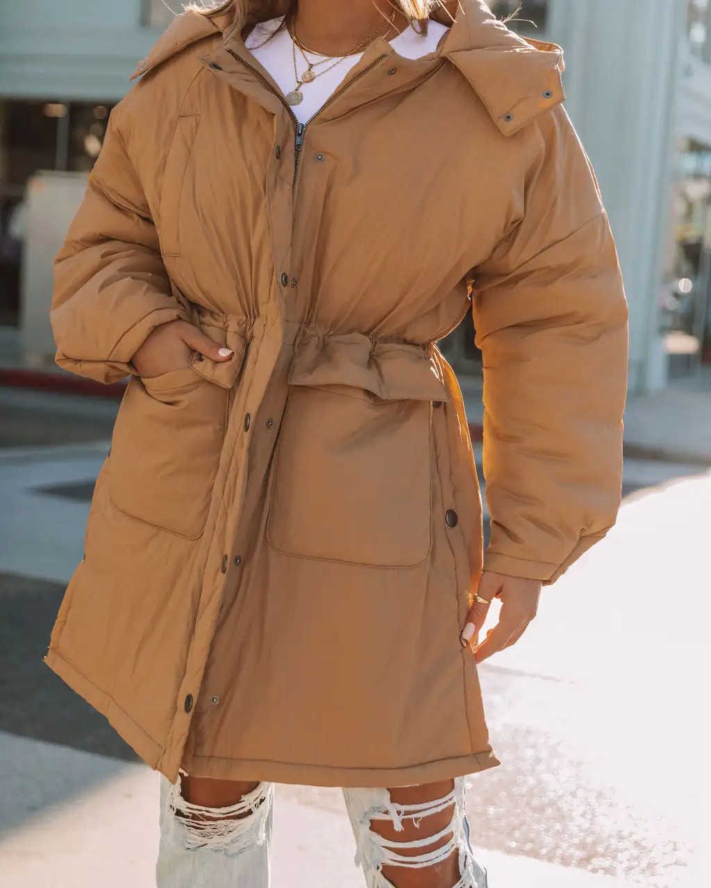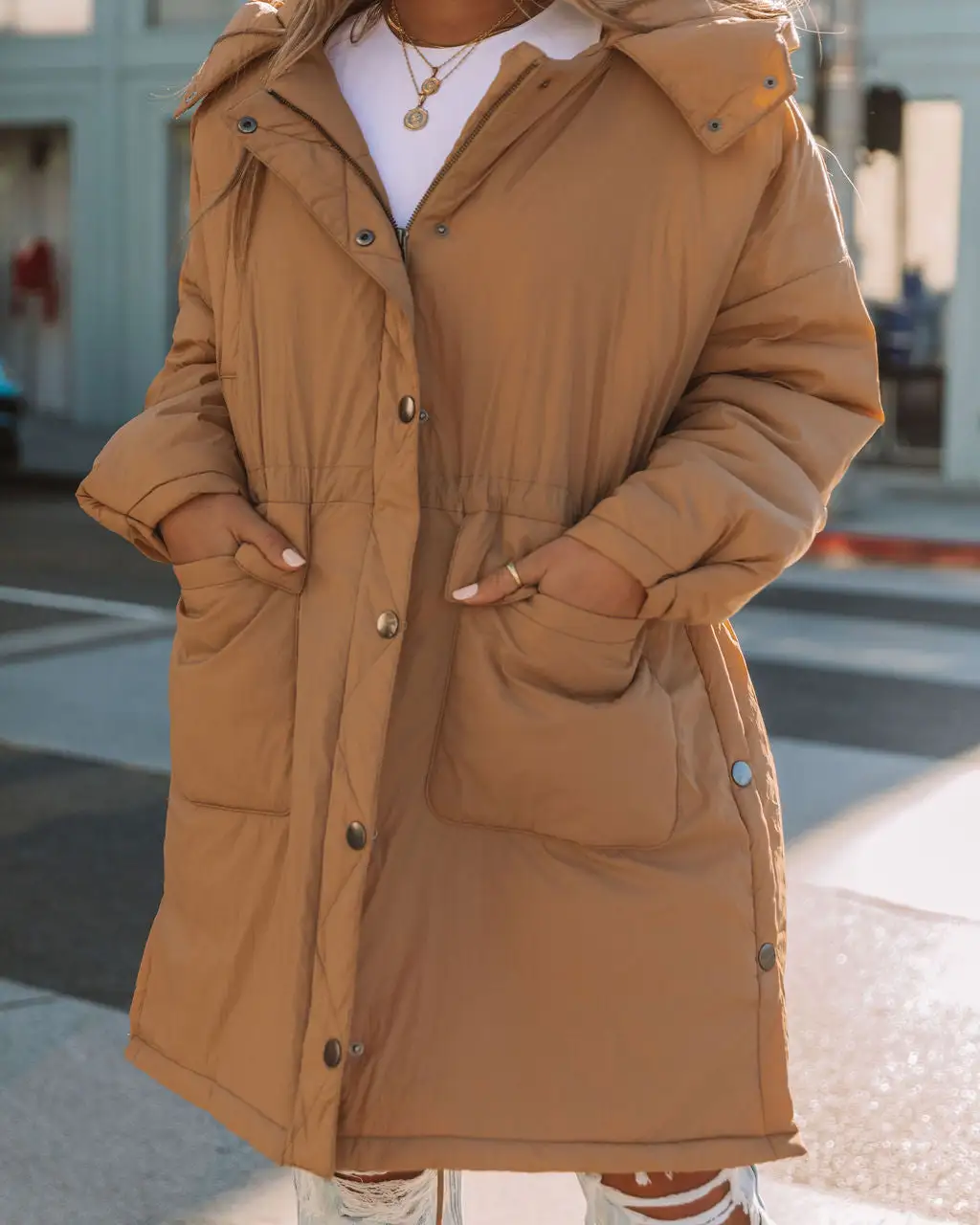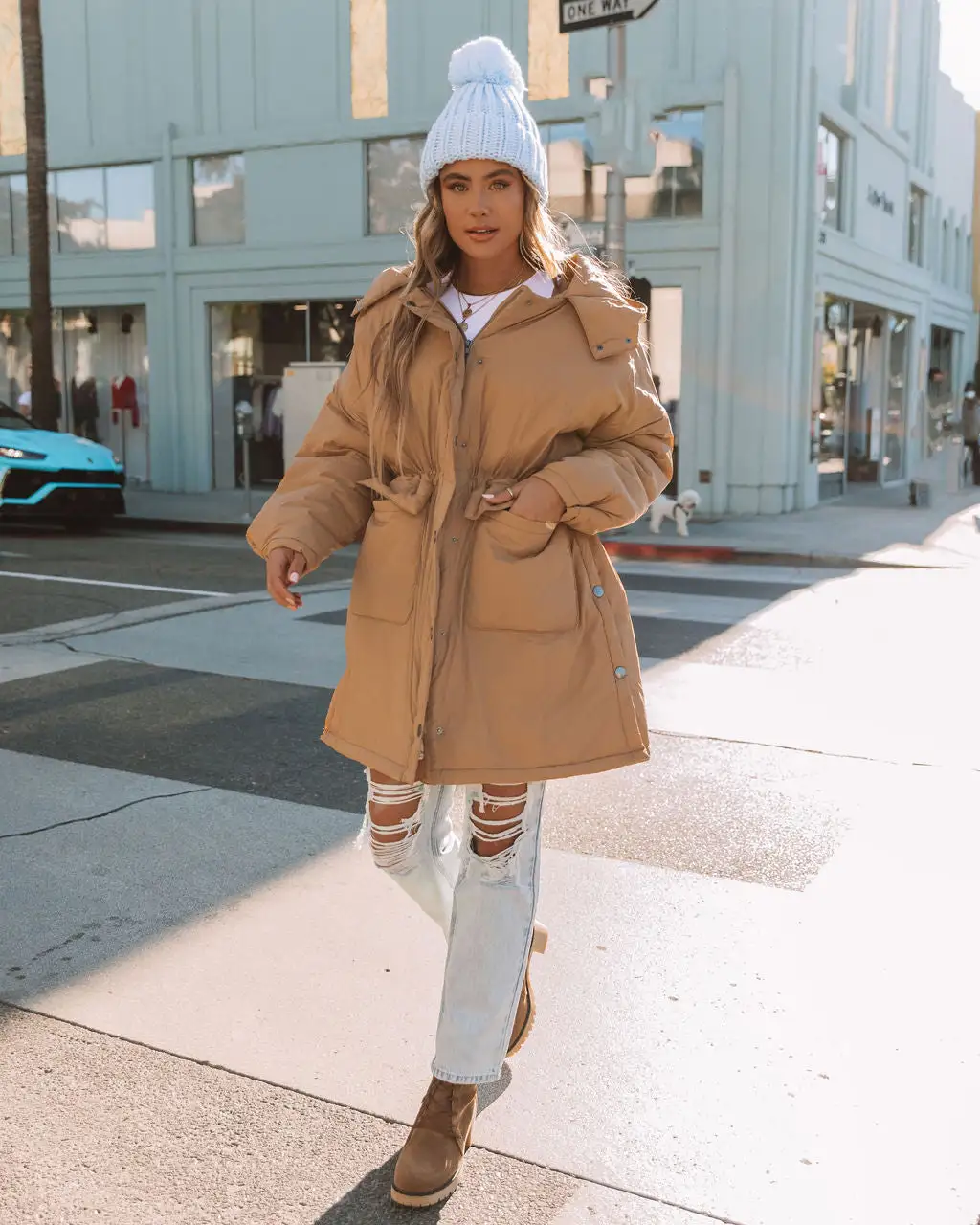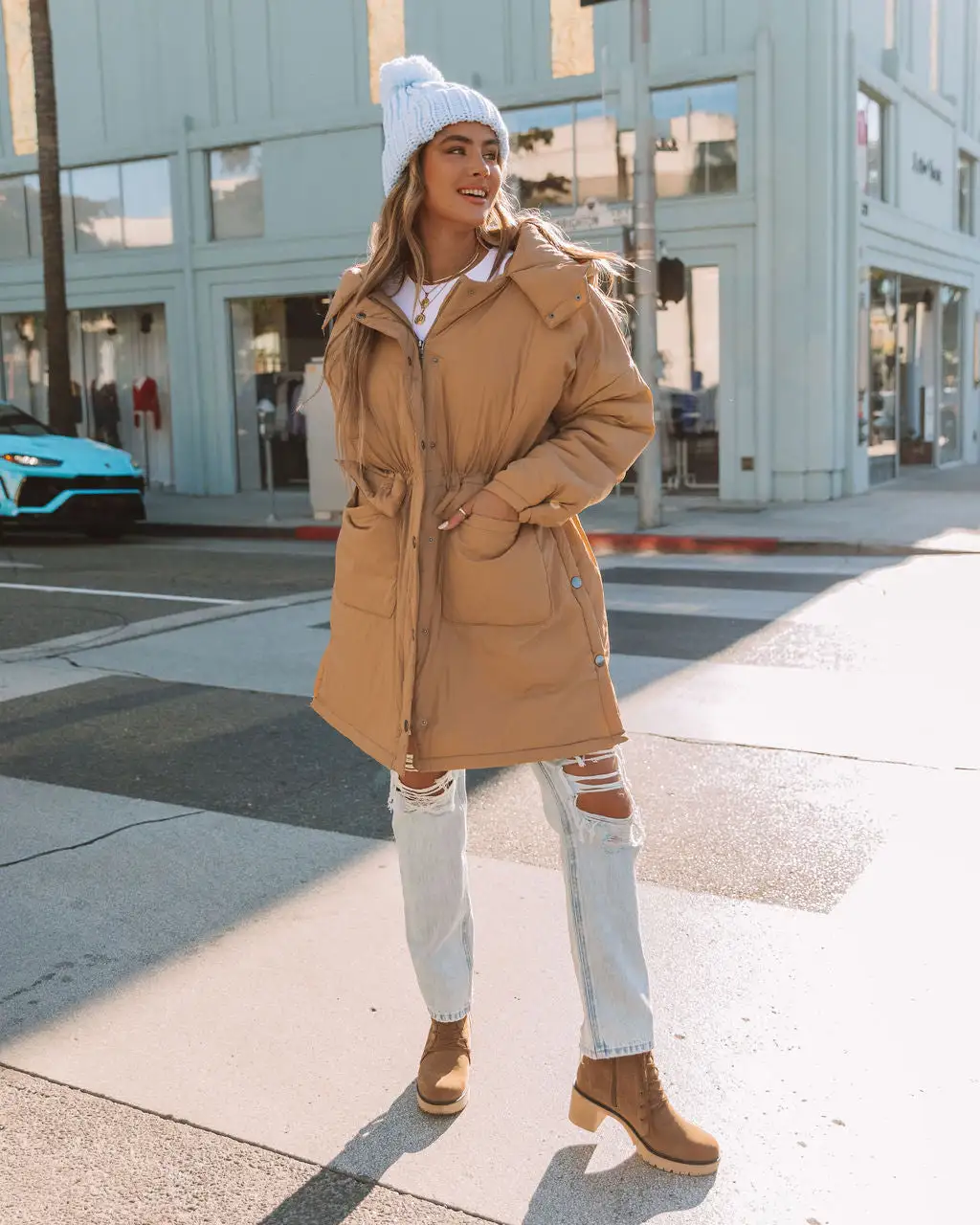Say goodbye to shivers in our Cayo Pocketed Hooded Parka Jacket! This cozy camel colored jacket features a non removable hood. Designed with front pockets and side snap buttons. Secured with a front zipper. Styled with the Whistler Pom Beanie, Minimal Herringbone Necklace, Emperor Coin Necklace, Kiki Knit Crop Top, Bass High Rise 90’s Acid Wash Distressed Denim, and Danny Lace Up Heeled Boot.