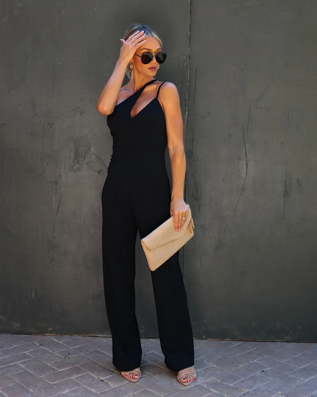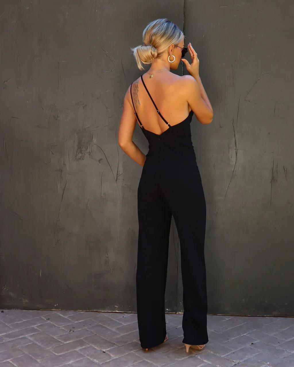 Look chic for your event in the Cedric One Shoulder Cutout Jumpsuit in black that features a flare leg.