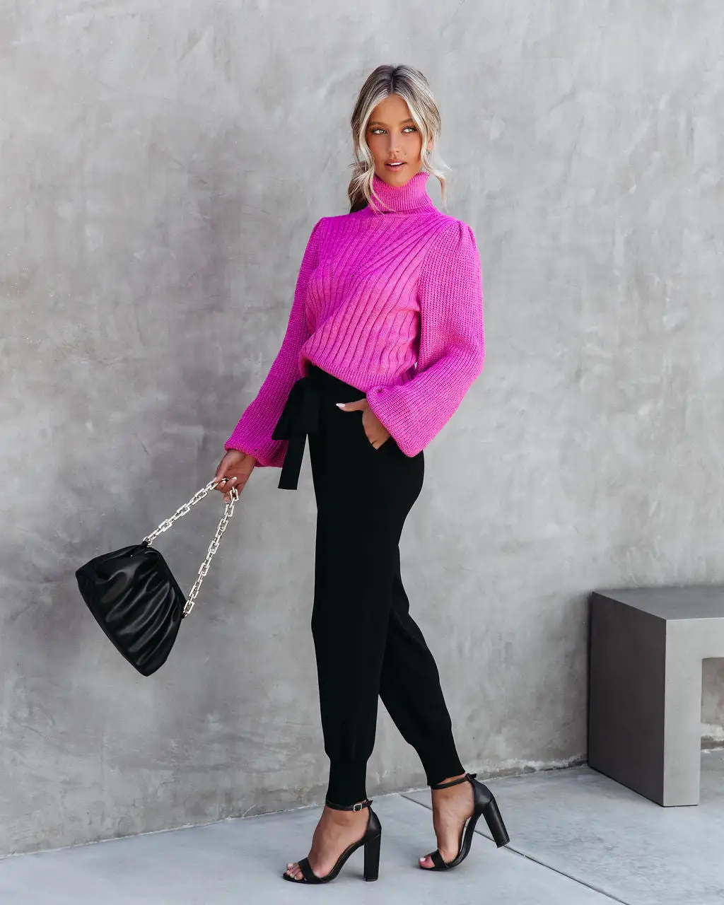 Get your hands on our Charlene Knit Turtleneck Sweater in orchid that features a turtle neckline.