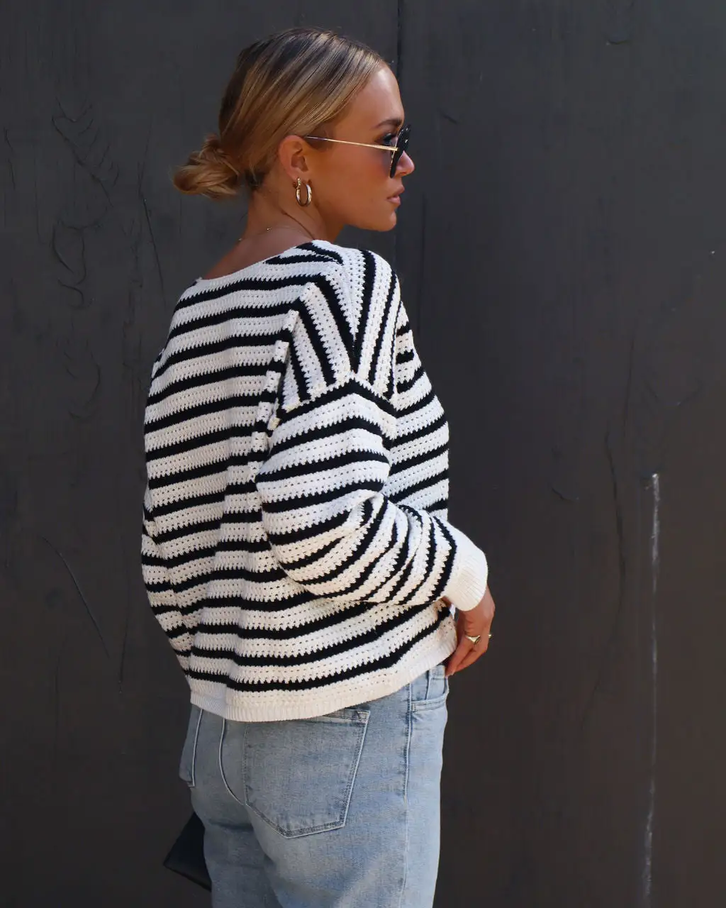 Keep it classic in the Chloe Knit Stripe Sweater in black and white that features a relaxed fit.