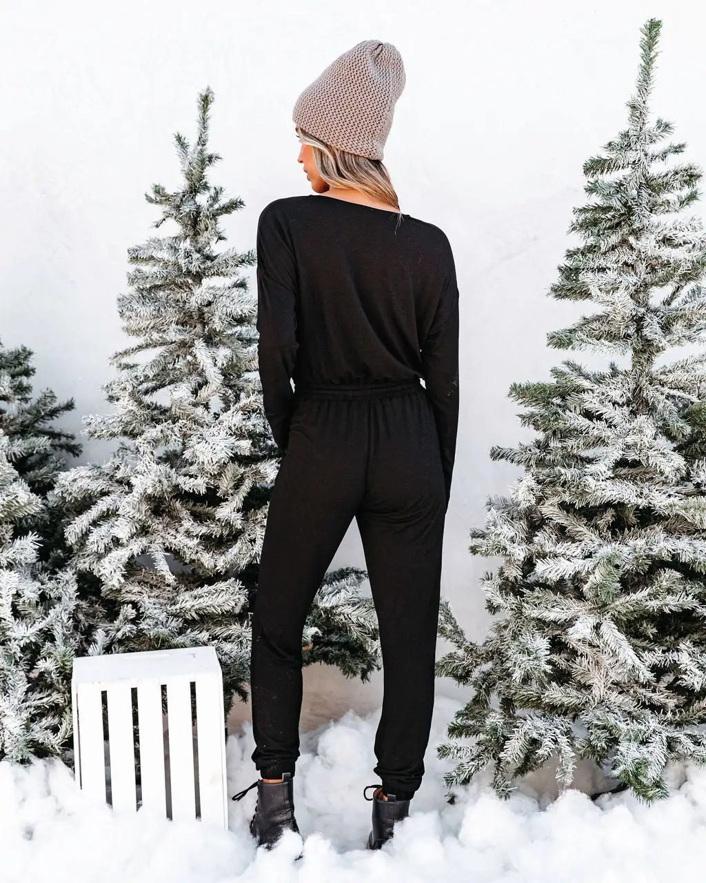 Upgrade your loungewear in the Colette Pocketed Drawstring Jumpsuit in black that features a draped neckline.