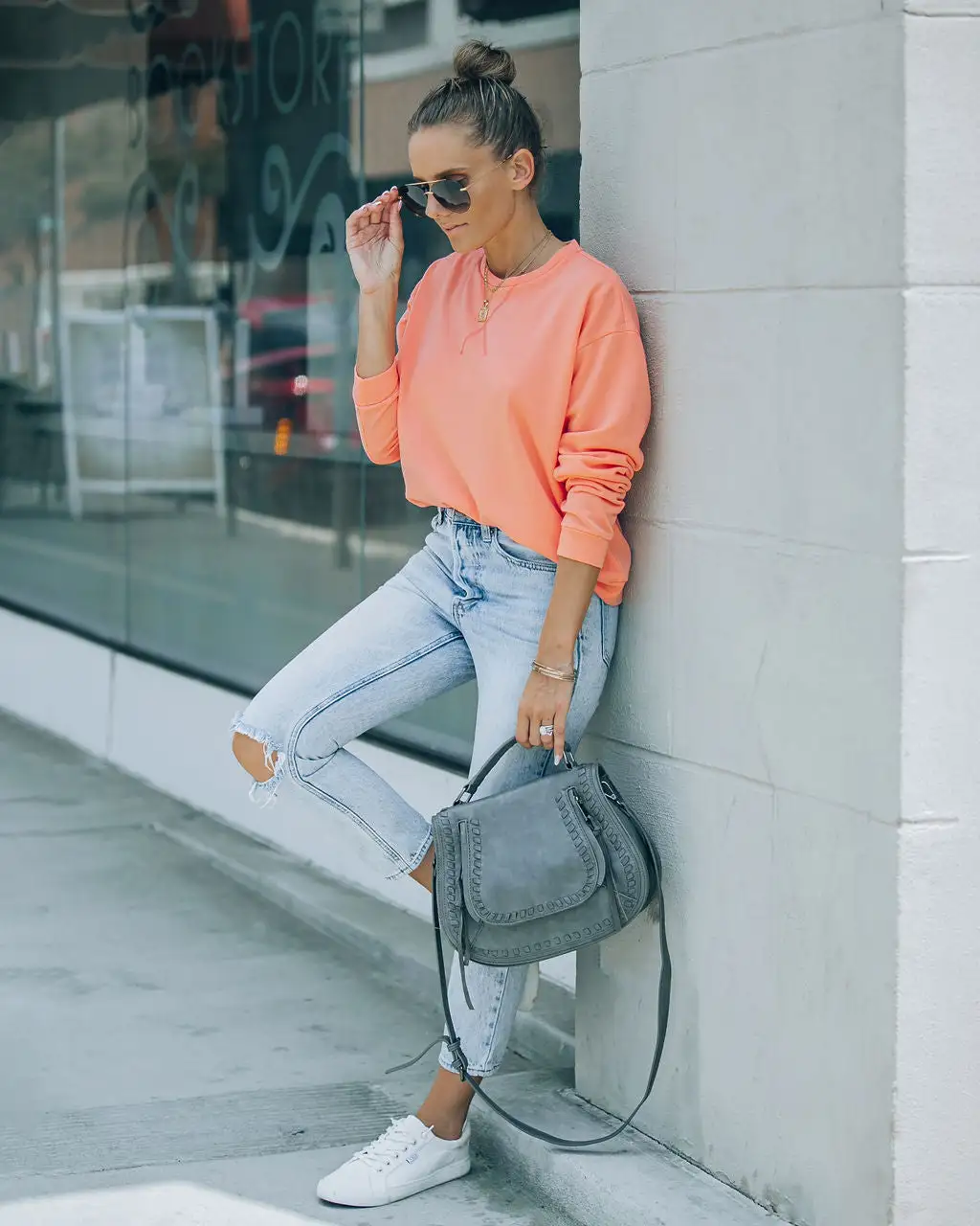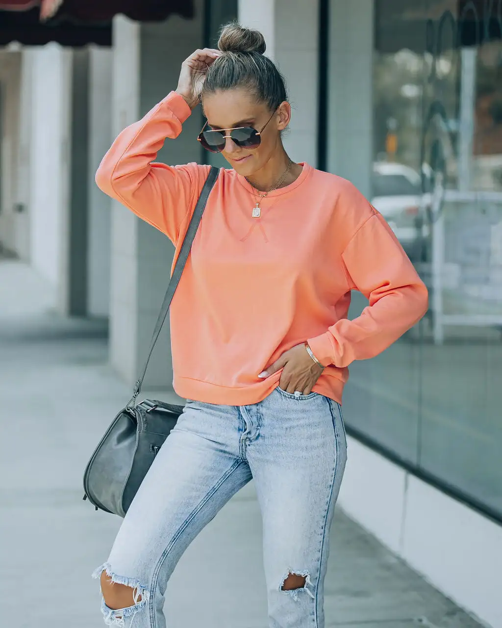 Cozy and chill, the Comfortably Me Lightweight Pullover in coral features a high neckline.