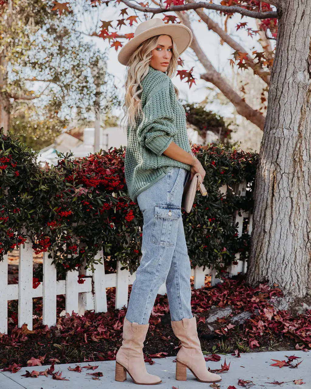 //Best Seller//New Color// Wander through the woods in our Connie Turtleneck Knit Sweater! This powder green sweater is detailed with a high neckline. Finished with rolled edges. Styled with the El Dorado Hat, Perfect Hoop Earrings, Simple Bangle Bracelet, Stella Crossbody Envelope Zip Clutch, Konner High Rise Cargo Denim, and Brooks Faux Suede Heeled Slouch Boot.