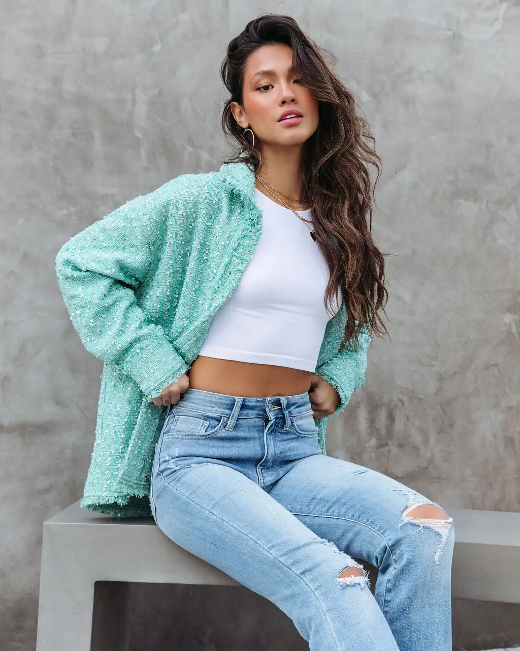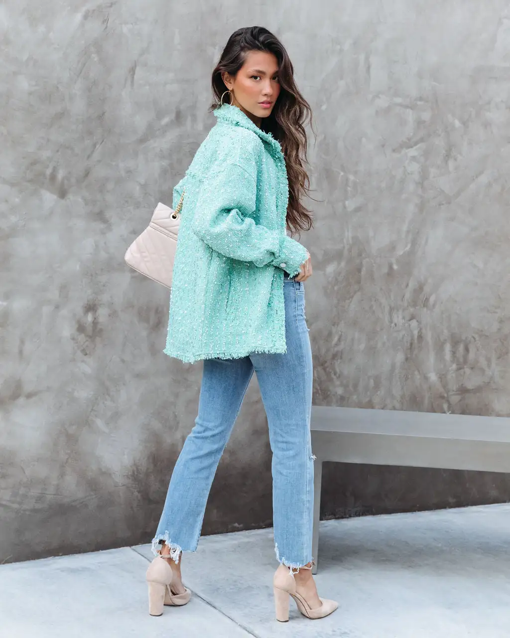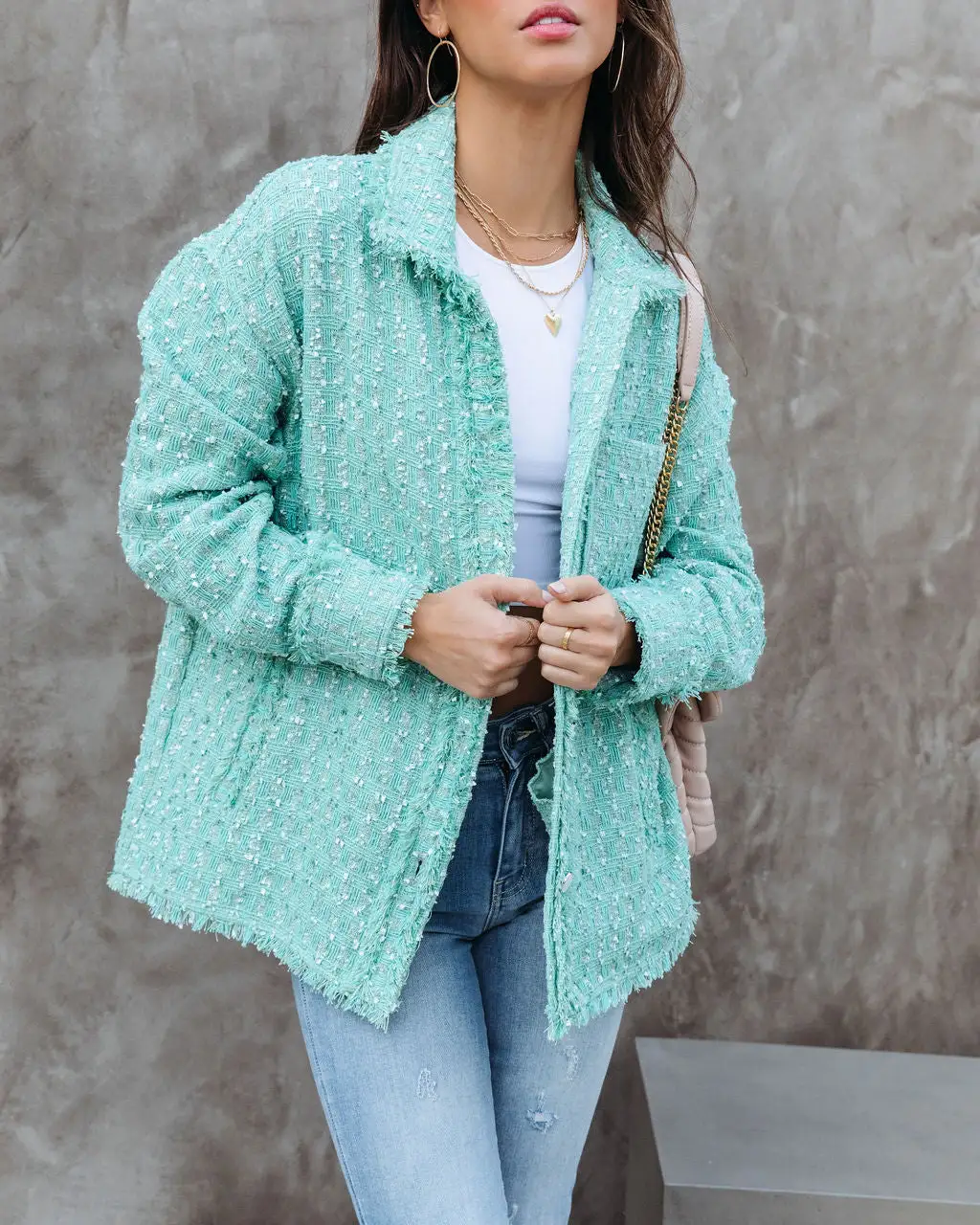 Always be warm in the Cover Girl Tweed Pocketed Jacket in pistachio that features a relaxed fit.