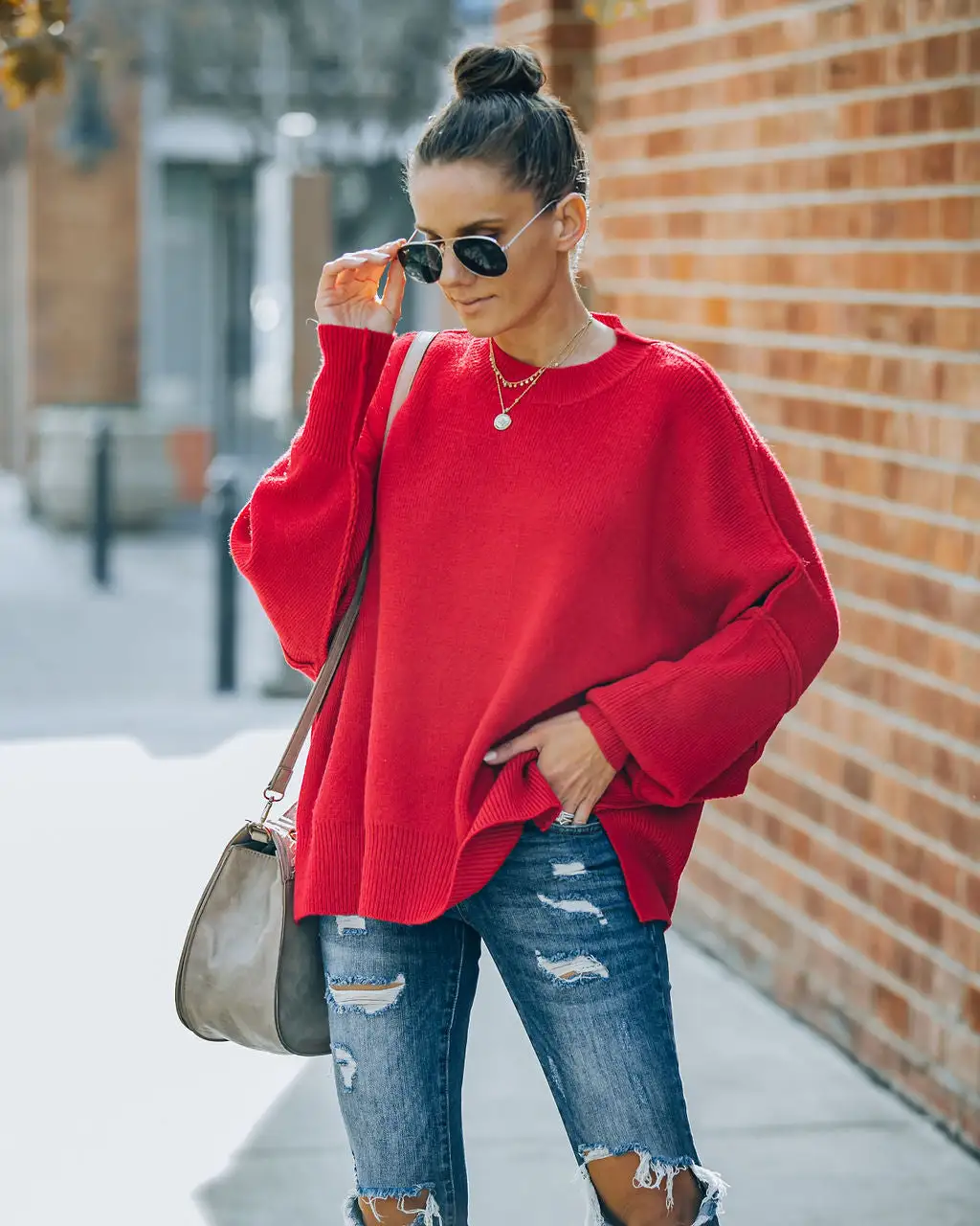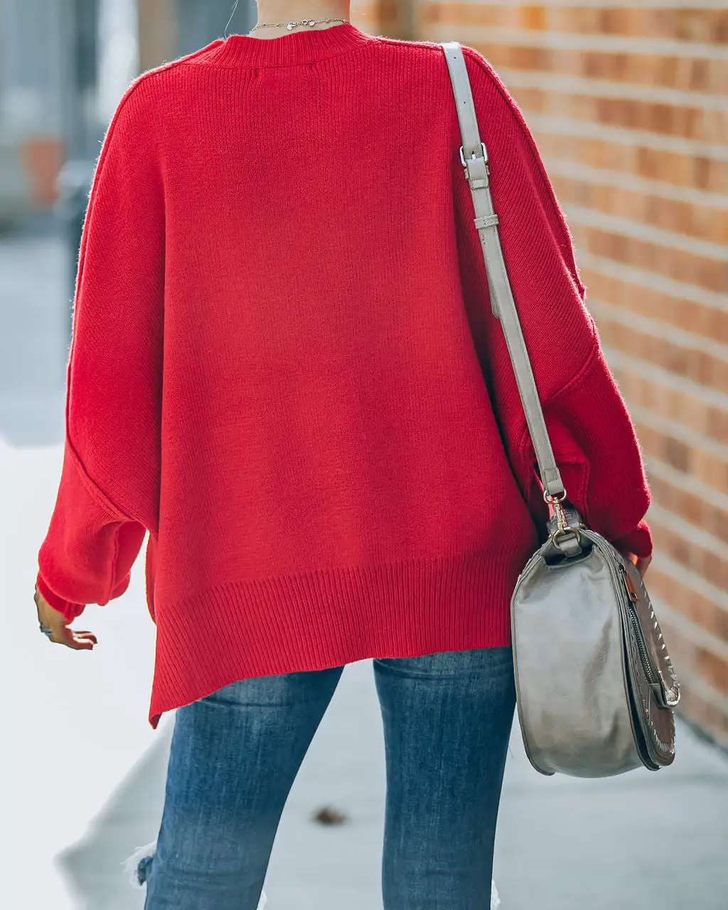 //VICI Exclusive// Best Seller// New Color// Our Dariel Relaxed Knit Sweater was made for colder weather! This red knit sweater features dolman sleeves and side slits. Designed with a mock neckline and a relaxed fit. The perfect tucking top! Styled with the Chloe Mini Necklace, Compass Coin Necklace, Simple Bangle Bracelet, Highland Bag, Universal Mid Rise Distressed Skinny, and Ritz Faux Suede Pointed Heel.