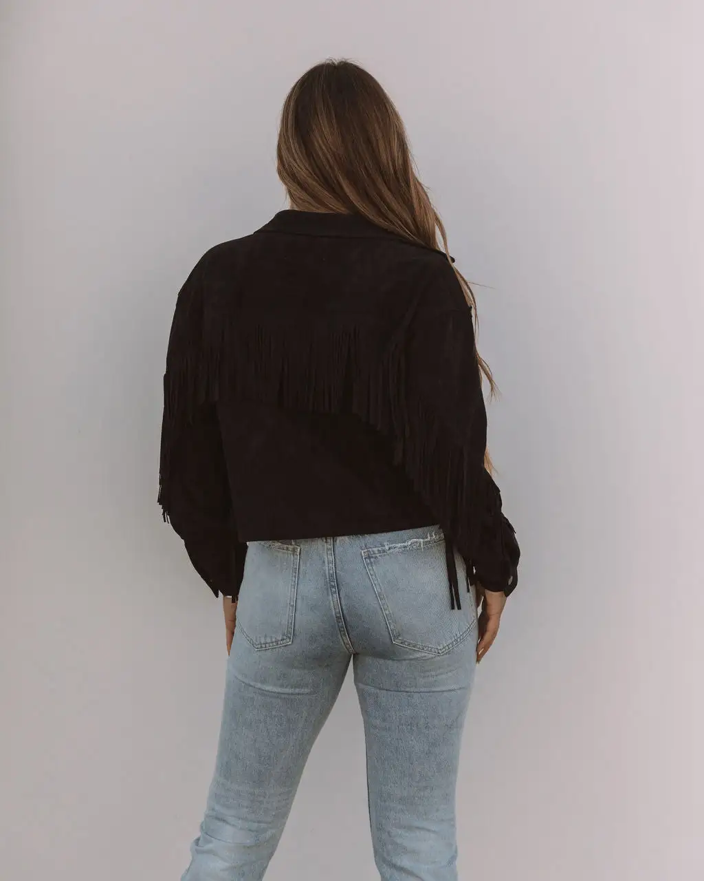 Our Daron Cropped Fringe Faux Suede Jacket is a cold weather hero! This black jacket features a fringe faux suede detailing. Designed in a cropped style and bust pockets. Finished with a collar. Styled with the Perfect Hoop Earrings, Ana Gold Coin Lariat, Kiki Knit Crop Top, Kason Distressed High Rise Denim, and Colby Faux Suede Heeled Bootie.