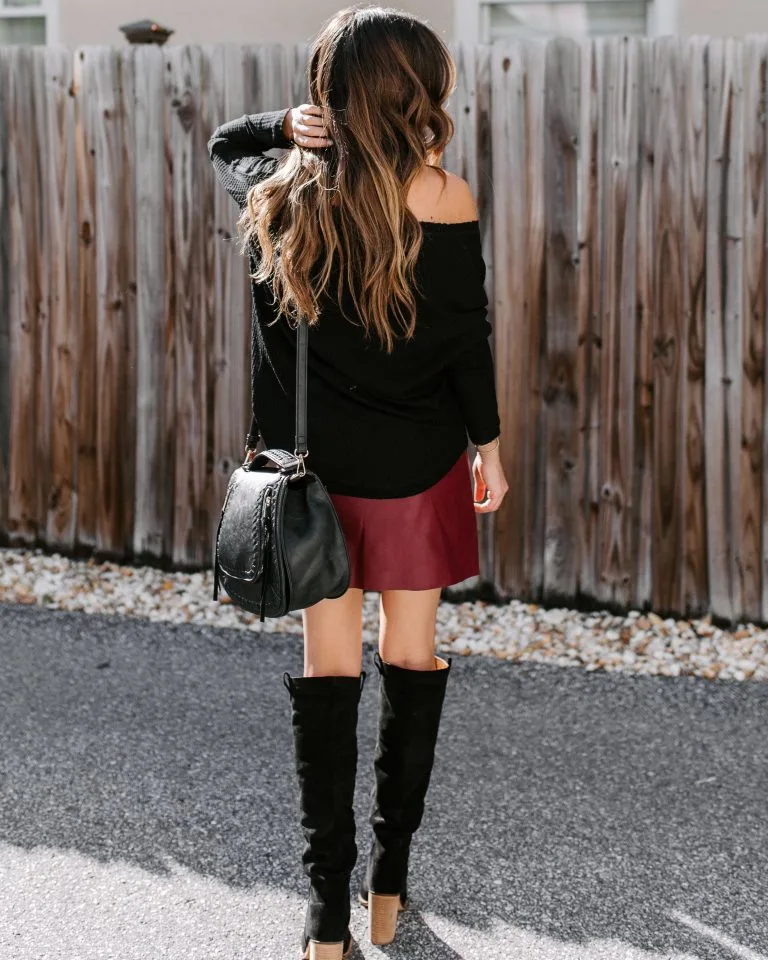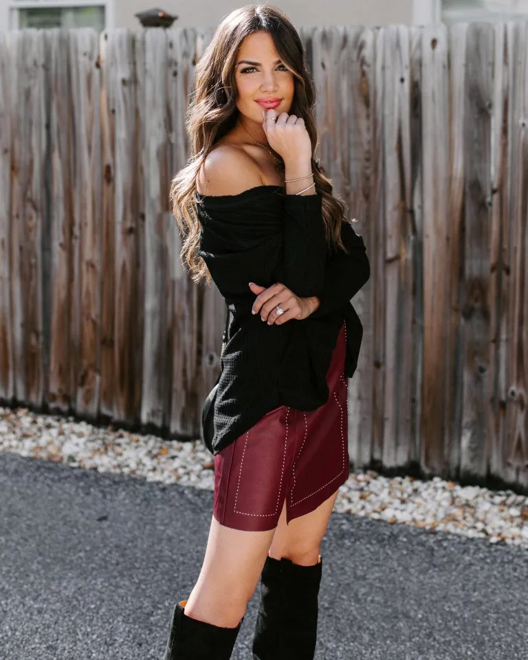 We’re taking a sassy classic and adding some edge to our Genius Is Patience Faux Leather Mini Skirt! Wine hued top stitched panels create the true to size fit while mini side slits elevate the look. Add a vintage tee, moto jacket and knee high boots for a trendsetter’s touch. Finished with a full lining and concealed side zipper closure. Styled with the Chloe Mini Necklace, The Buddha Wheel Necklace, Between Us Thermal Knit Top, Saint Slouch Boot and the Highland Bag.