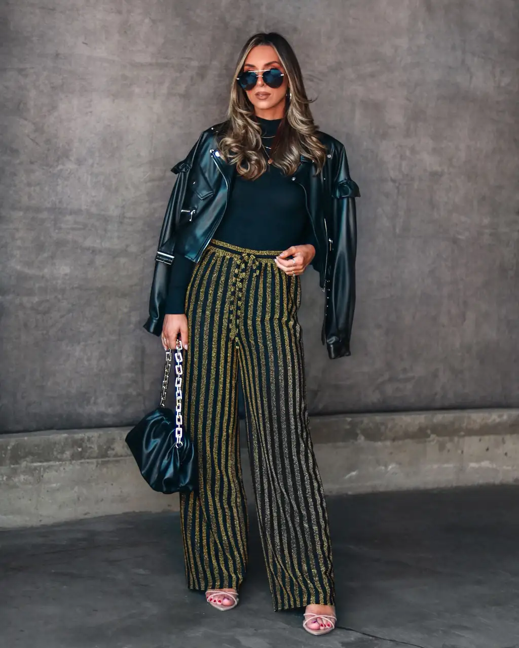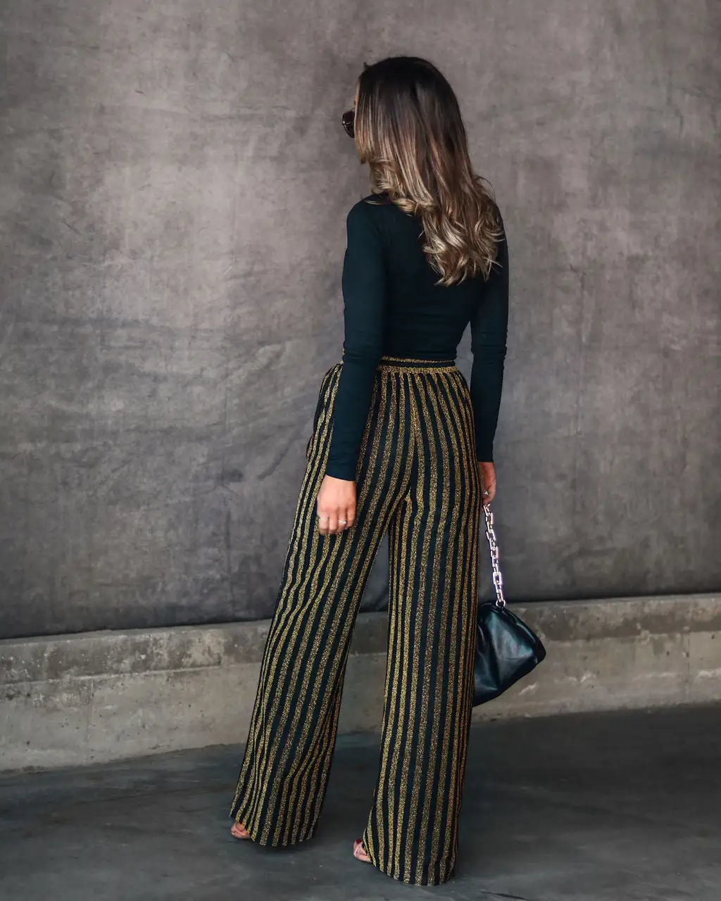 Elevate your look in the Wynona Pocketed Stripe Metallic Pants in black and gold that feature side pockets.