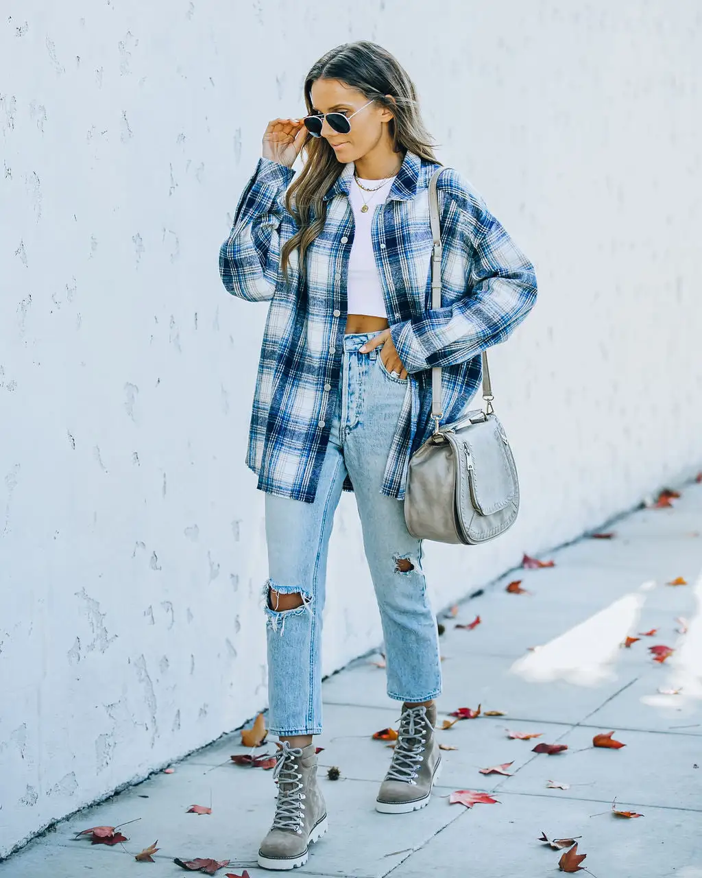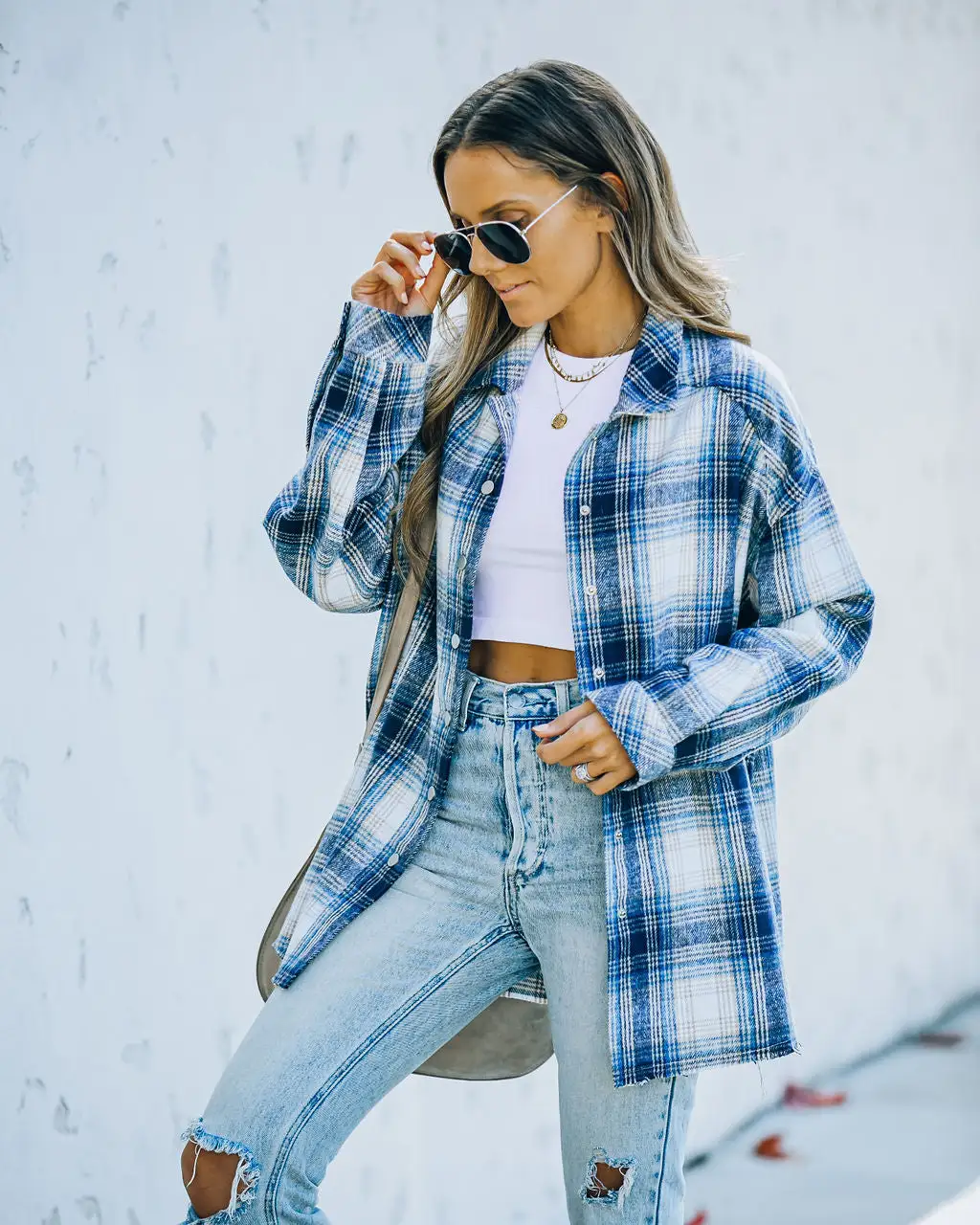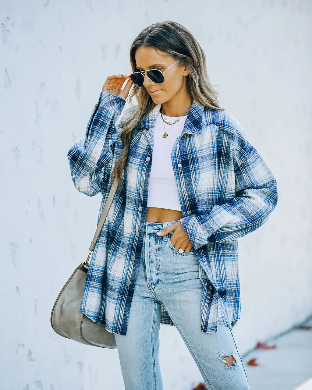 Keep it casual in our Denise Plaid Button Down Shacket! This navy, cobalt, taupe, and white plaid shacket is detailed with a frayed hemline. Designed with button cuffs and front button closures. Styled with the Chloe Mini Necklace, Minimal Herringbone Necklace, Compass Coin Necklace, Simple Bangle Bracelet, Highland Bag, Kiki Knit Crop Top, Kason Distressed High Rise Denim, and Arlene Faux Suede Lace Up Boot.