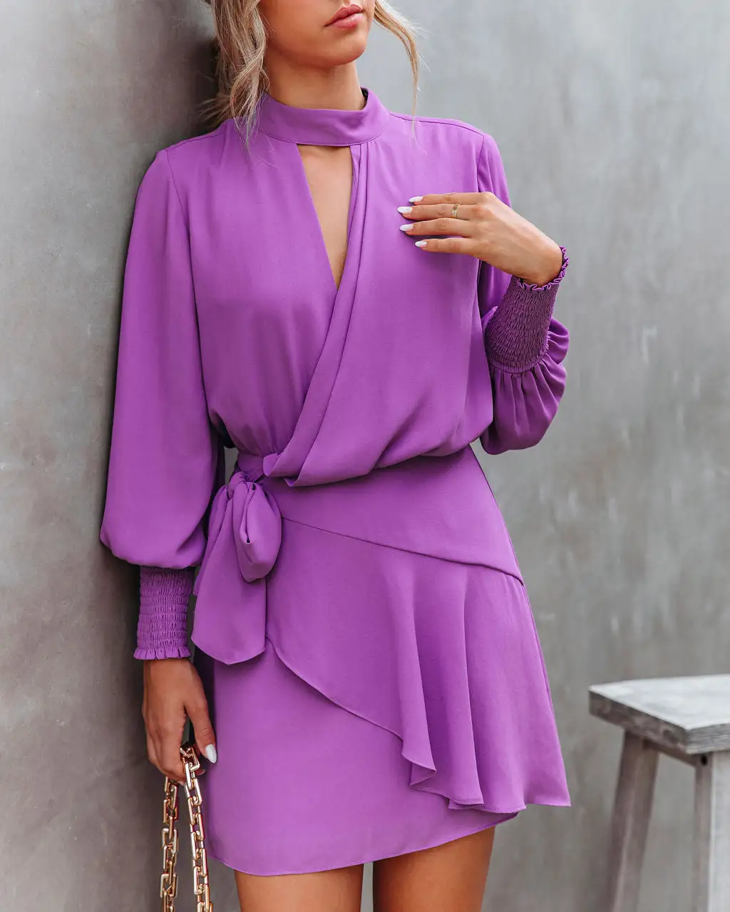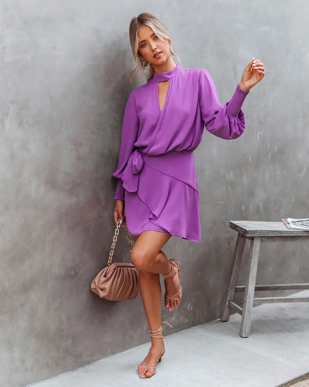 Look classy at your next special event in our Lindy Drape Keyhole Dress! This orchid drape mini features a front keyhole and smocked cuffs. Designed with a faux wrap skirt and an adjustable tie. Styled with the Perfect Hoop Earrings, Chic Crossbody Chain Pouch Bag, and Bella Faux Leather Strappy Kitten Heel.