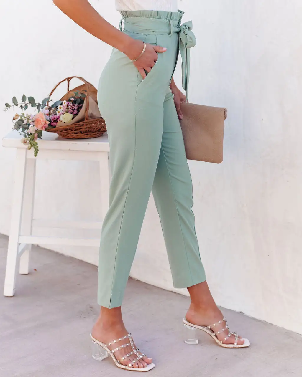 Designed in a sage hue, the Point Made High Rise Pocketed Trousers sit high waisted and cinched with a removable fabric waist tie.