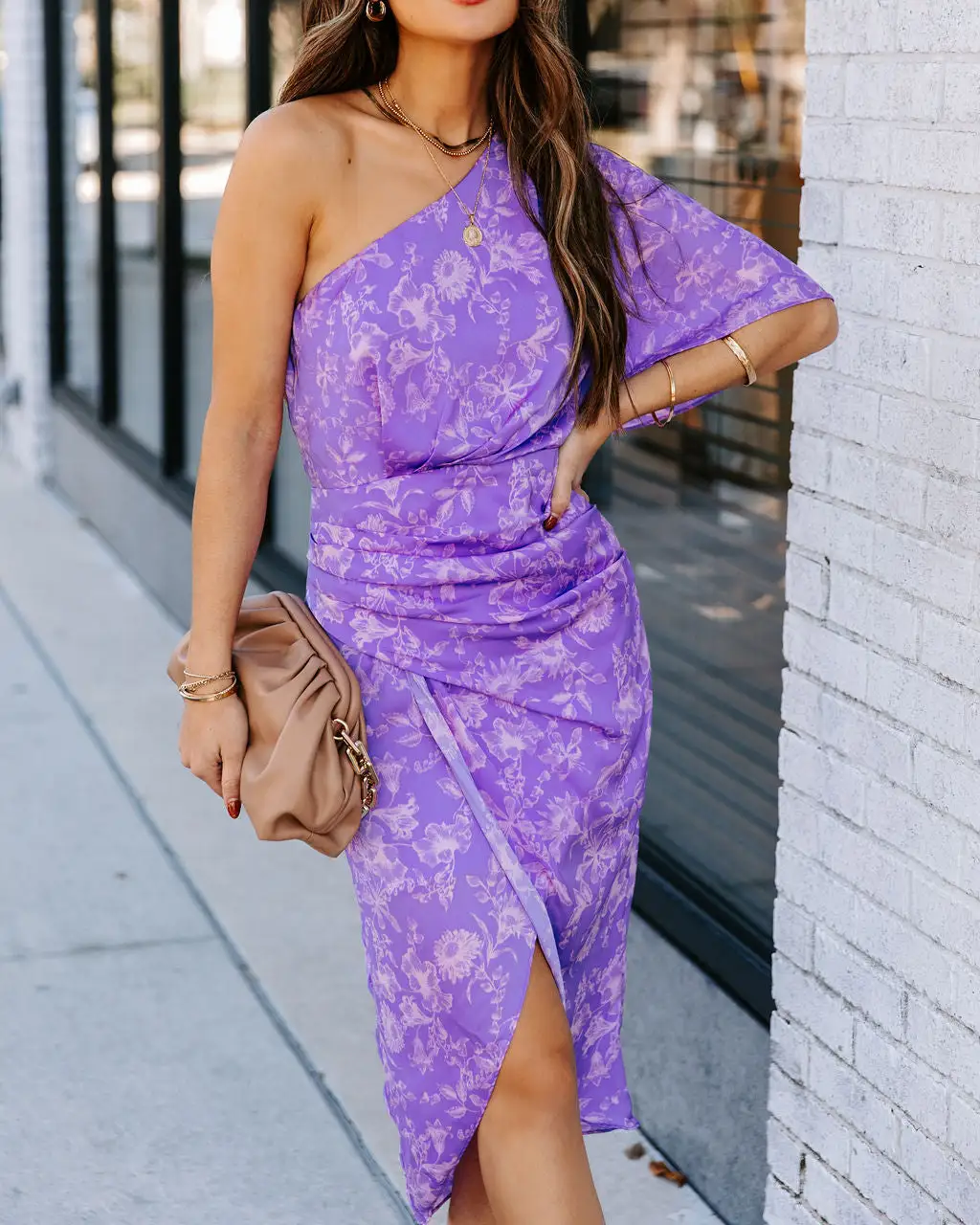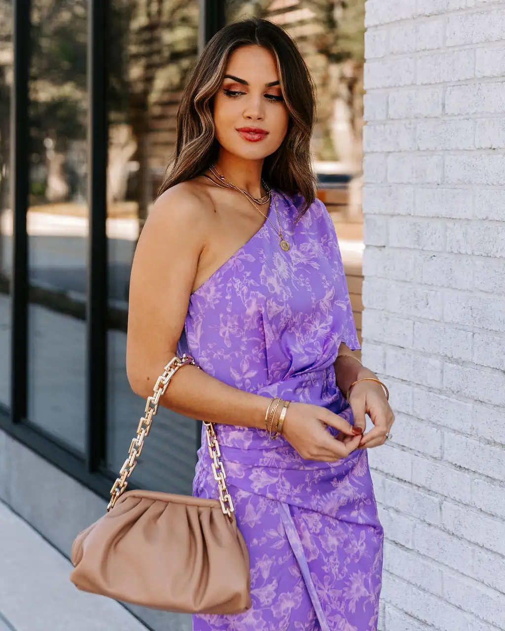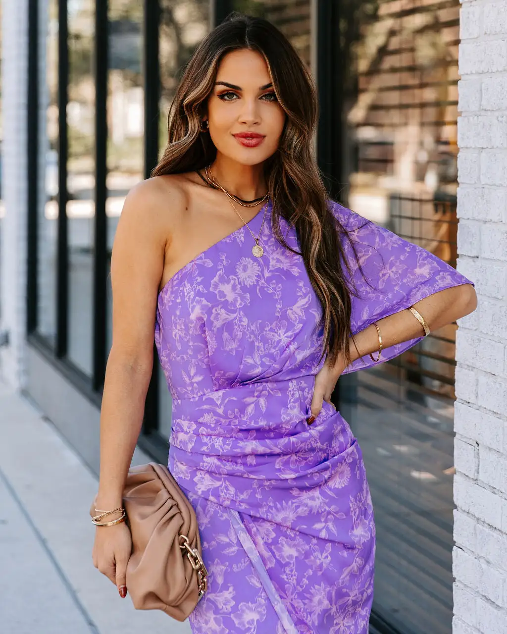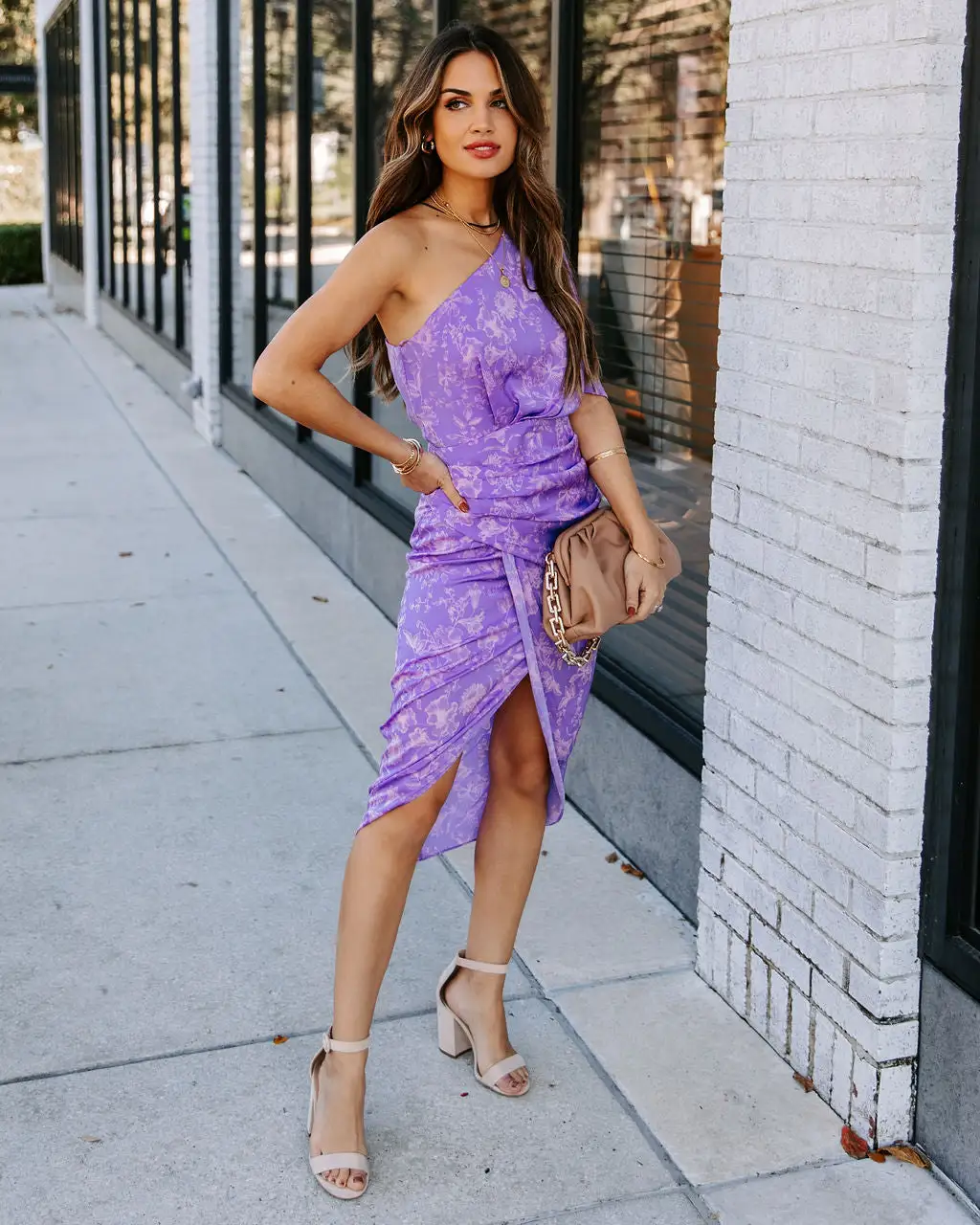 Our Visha Floral One Shoulder Drape Dress truly stands out! This lavender and blush floral dress features a one shoulder neckline. Designed with a ruched skirt and a concealed side zipper closure. Styled with the Mercury Hoops, Minimal Herringbone Necklace, Emperor Coin Necklace, Simple Bangle Bracelet, Formal Faux Suede Heel and Chic Crossbody Chain Pouch Bag.