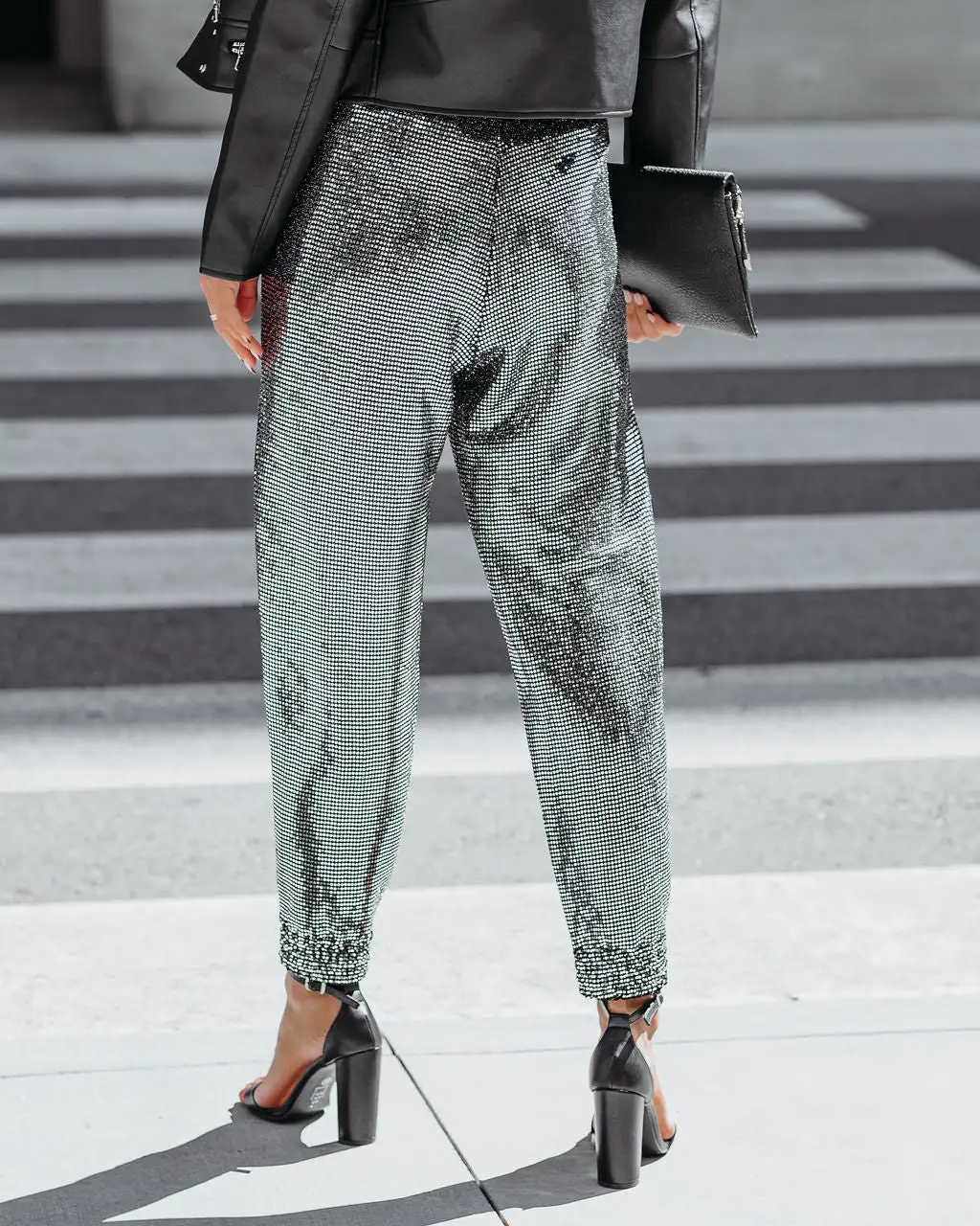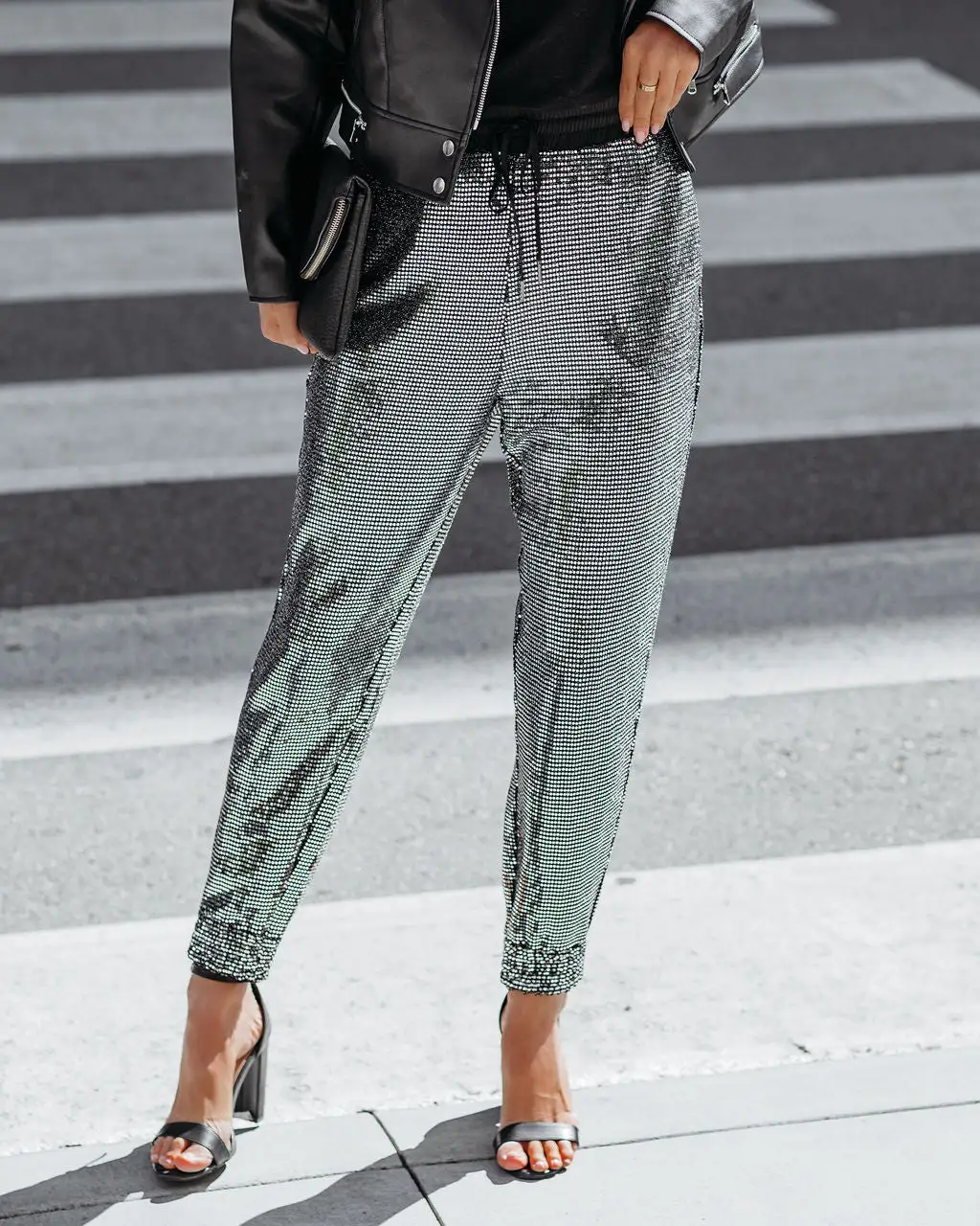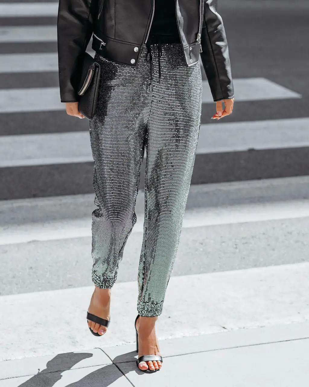 Get the party started in our Zealous Pocketed Sequin Joggers! These black base pants are detailed with silver sequins throughout. Designed with an elastic drawstring waistband and side pockets. Styled with the Carson Black Frame Dark Smoke Polarized Sunglasses, Perfect Hoop Earrings, Chloe Mini Necklace, Gaia Coin Necklace, Stella Crossbody Envelope Zip Clutch, Physique Racerback Tank, Gramercy Pocketed Faux Leather Moto Jacket, and Whimsy Heel.