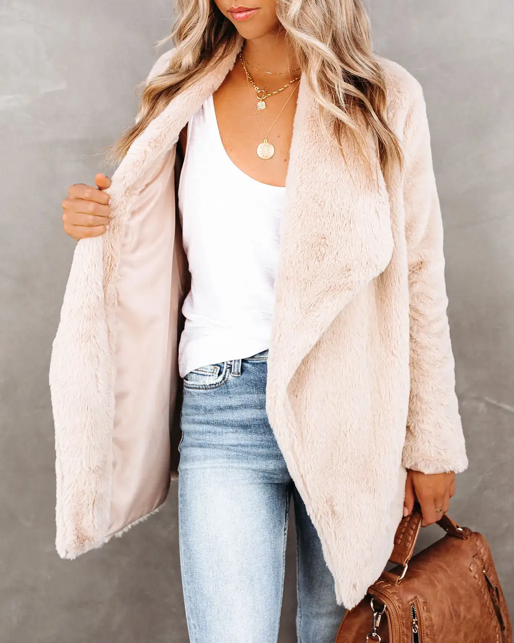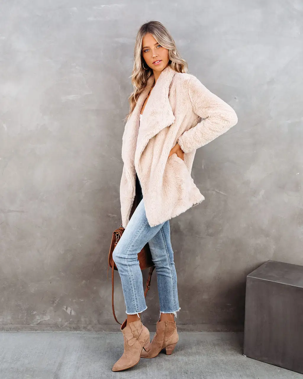 //VICI Exclusive// Looking for a soft and luxe coat for the cold weather ahead? Our Do The Trick Pocketed Faux Fur Drape Coat has got you covered! This almond hued faux fur coat features a relaxed fit with a draped front, long sleeves and side pockets. The effortless open front silhouette makes layering a breeze!