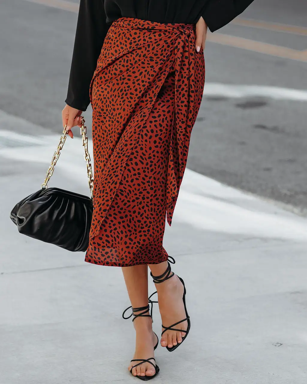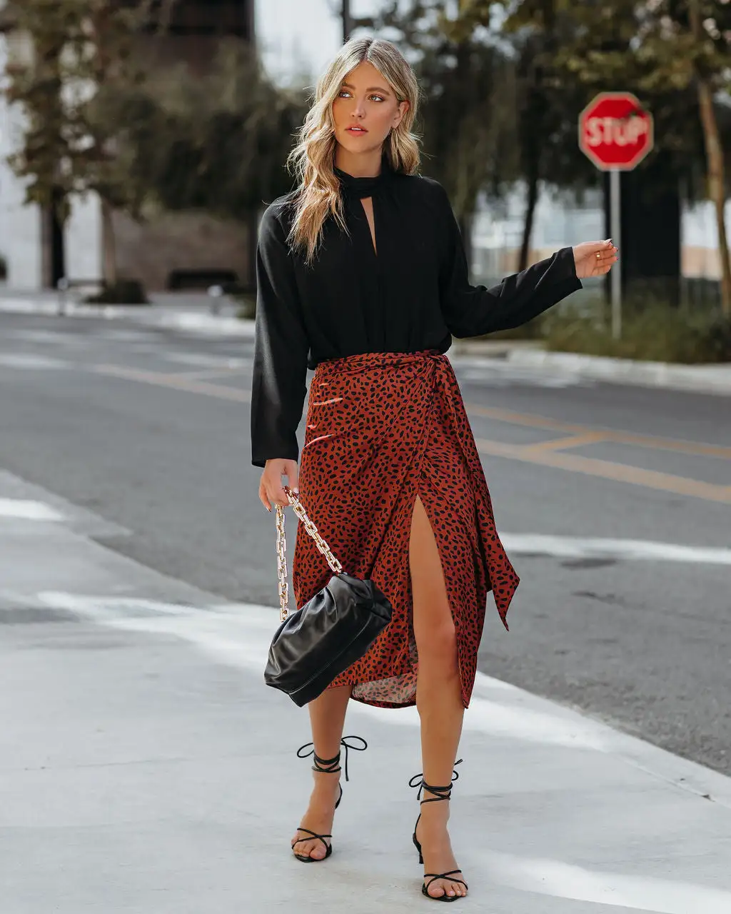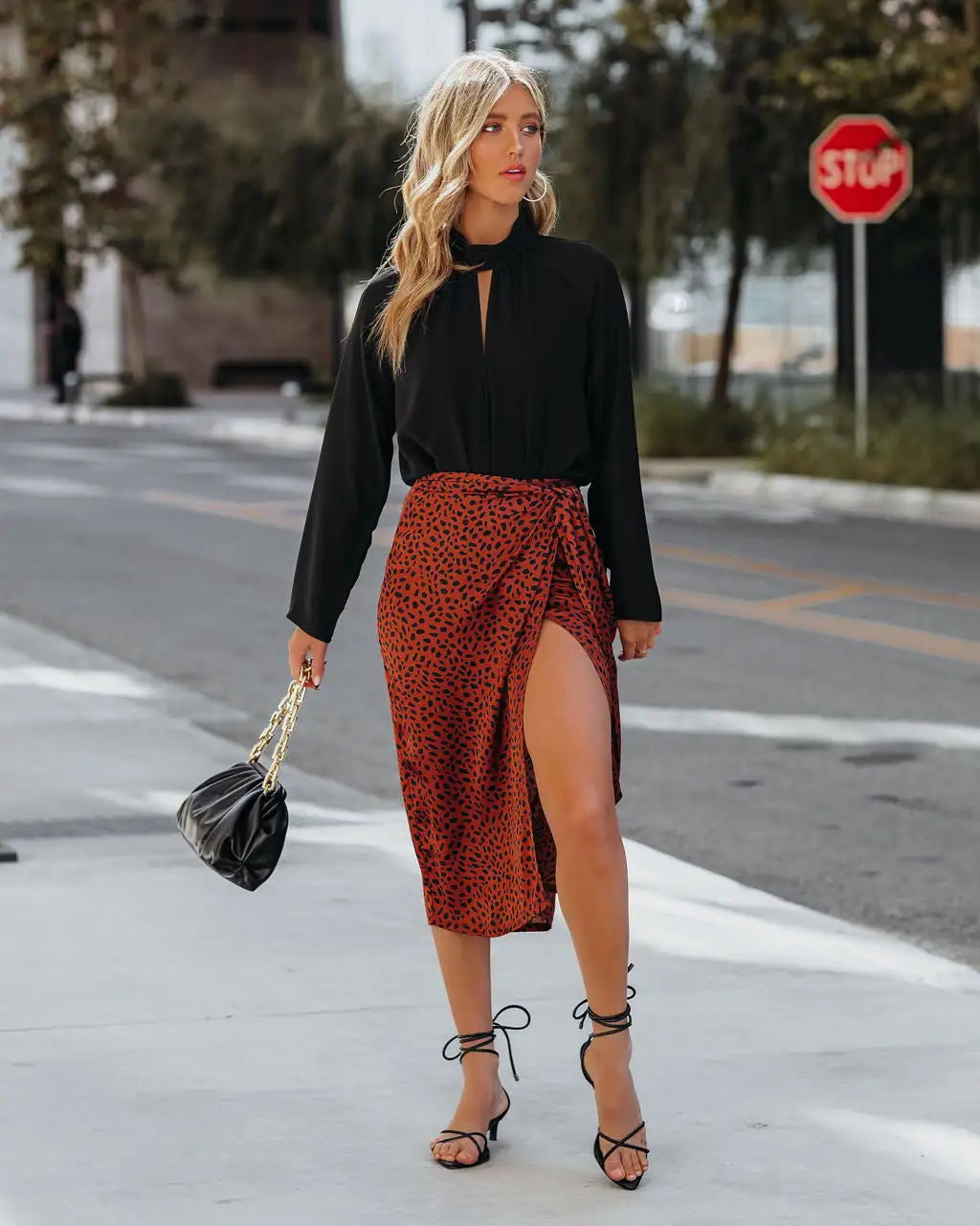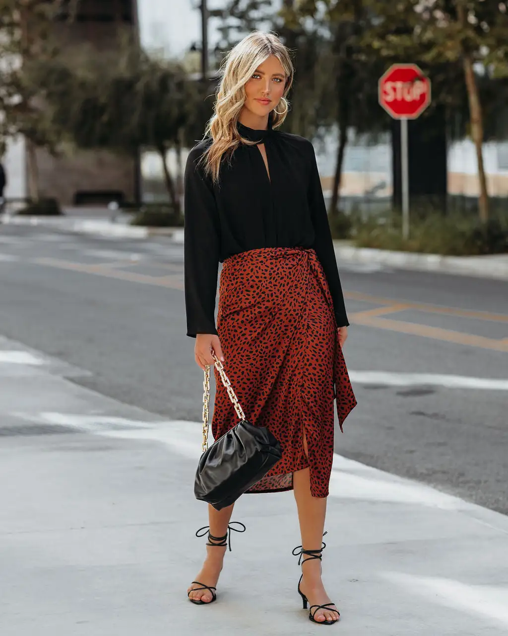 Try our Avianna Satin Printed Wrap Midi Skirt with a cable knit sweater! This dark rust and black printed skirt is crafted with an adjustable waist tie closure. Finished with a side slit. Styled with the Perfect Hoop Earrings, Atlas Keyhole Bodysuit, Chic Crossbody Chain Pouch Bag, and Bella Faux Leather Strappy Kitten Heel.