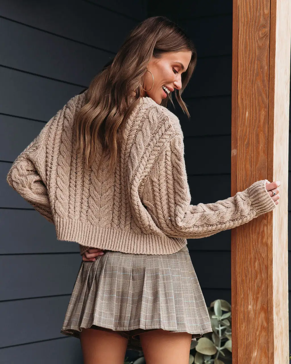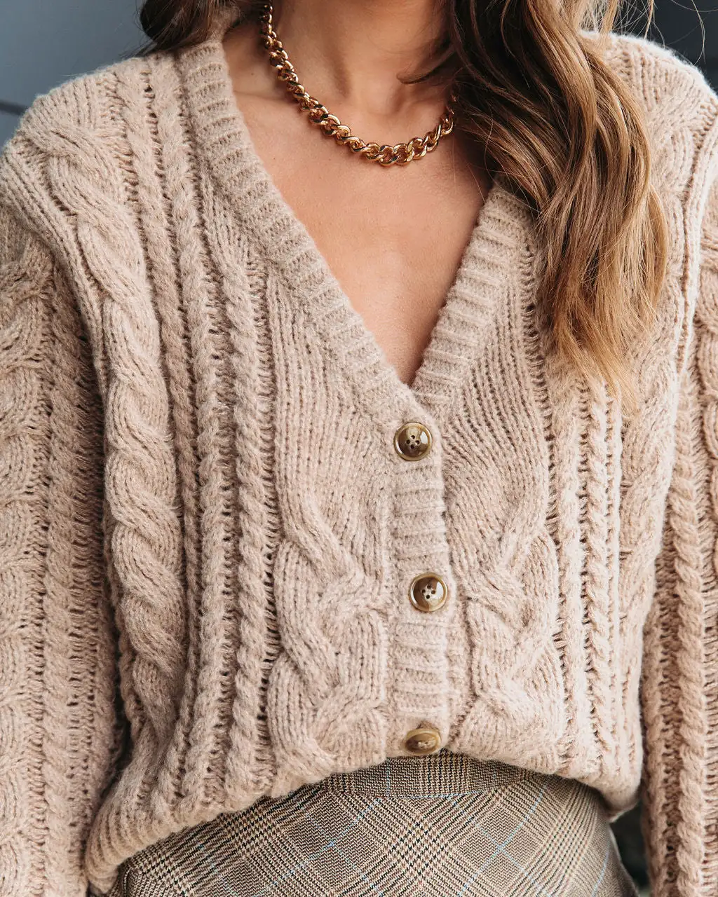 Elevate your Winter style in the Delfina Knit Button Front Cardigan in taupe that features a v-neckline.