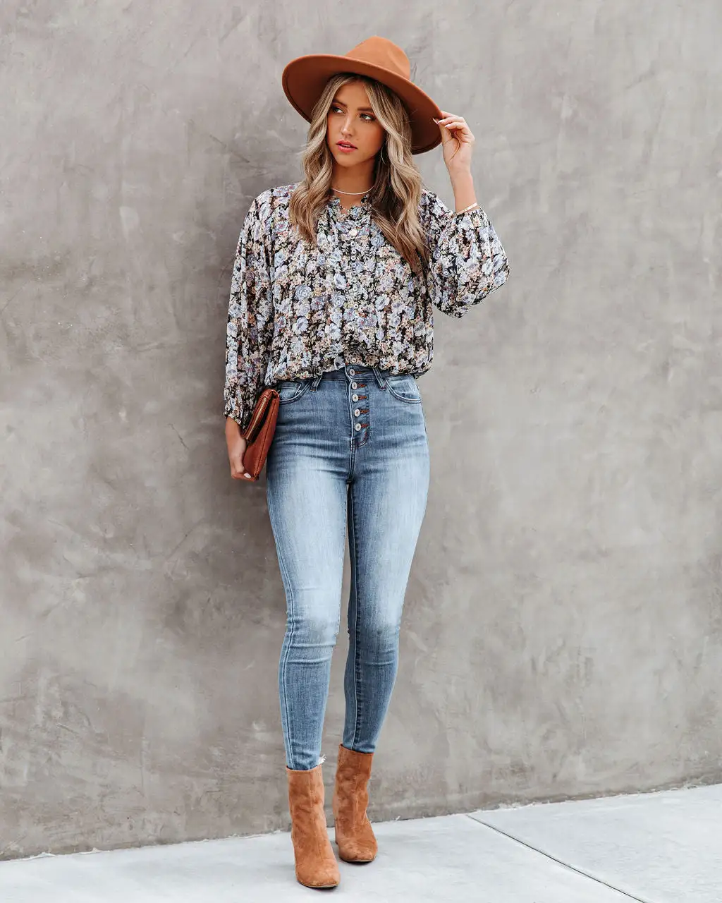 Muted florals are having a moment right now! Our Edgewater Floral Billowed Blouse features midnight navy, olive, yellow, white, brown, navy, and dusty blue florals. Designed with a billowed front and an elastic waistband. Styled with the El Dorado Hat, Perfect Hoop Earrings, Minimal Herringbone Necklace, Chloe Mini Necklace, Compass Coin Necklace, Simple Bangle Bracelet, Stella Crossbody Envelope Zip Clutch, Only The Best High Rise Button Front Skinny, and Colby Faux Suede Heeled Bootie.