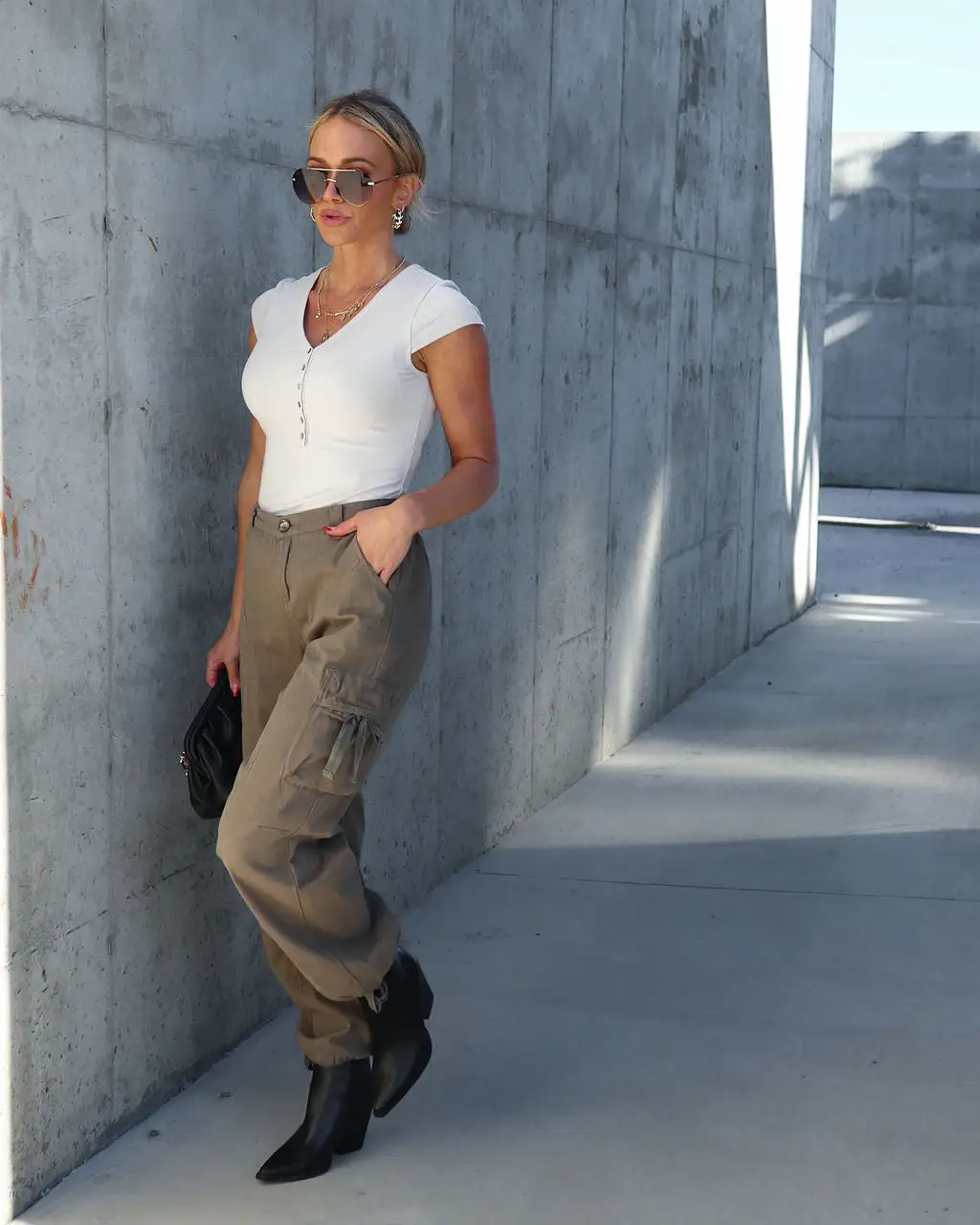 Every closet needs the Far From Basic Ribbed Henley Bodysuit in light taupe that features front button closures.
