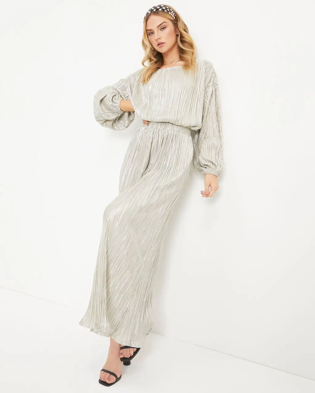 Our Kiyara Pocketed High Rise Plisse Pants are ready for all of your holiday gatherings! These silver shimmery pants are fit with an elastic waistband. Designed with wide pant legs and side pockets.