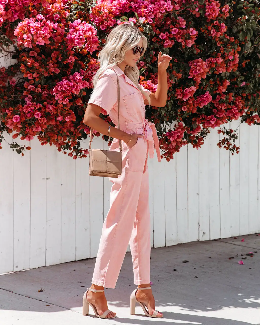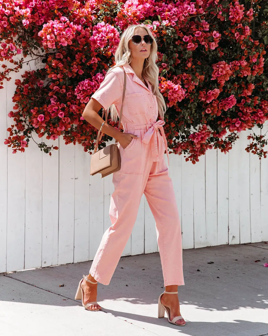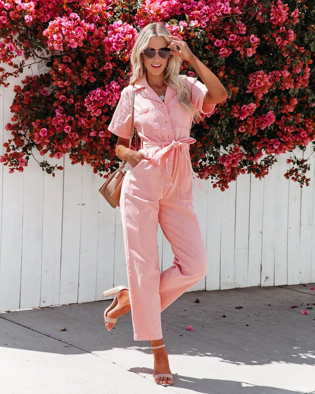 //Best Seller// New Color// Embrace utilitarian style in the Dumbo Cotton Pocketed Denim Jumpsuit in a light coral hue with front button closures and sewn cuffed short sleeves.
