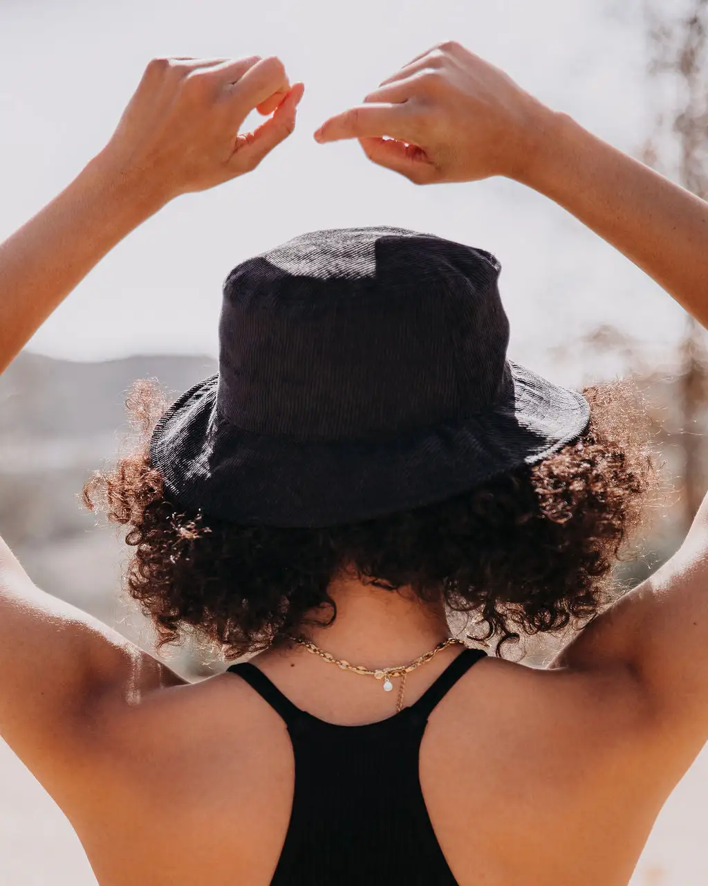 We know you’ve seen bucket hats everywhere by now! Our Echo Corduroy Bucket Hat is right on trend in its black ribbed style with a non adjustable fit. This hat looks amazing paired with a dress and sneakers! Styled with the Perfect Hoop Earrings, Stallion Chain Necklace, Compass Coin Necklace, and Cardinal Ribbed Racerback Brami.